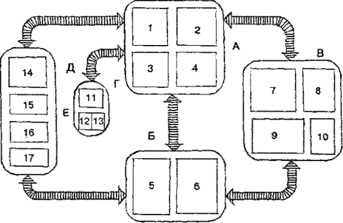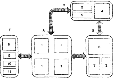 Рис. 1. Схема четырехуровневого построения реабилитационной среды для детей с легкими недостатками развития I уровень. Для микрорайонов малой плотности застройки целесообразным представляется в обычных школах оборудование 2-3 мест в каждом классе для возможного обучения детей с нарушениями слуха, зрения, опорно-двигательного аппарата (ОДА). При этом школа должна быть целиком адаптирована к пребыванию детей-инвалидов. II уровень. В микрорайонах средней плотности застройки (9-12 тыс. чел.) в обычных школах возможно формирование отдельного класса (10-12 чел.), где учащиеся имеют один вид нарушений меньшей или большей степени (т.е. только с нарушением зрения, слуха или ОДА). В этом случае вся школа адаптируется с учетом конкретных отдельных требований. III уровень. Для микрорайонов с высокой плотностью застройки (более 16 тыс. чел.) в структуре укрупненных школ с клубно-спортивными блоками предлагается выделение отдельных учебных секций для обучения детей-инвалидов. При таком решении для возможности посещения учащимися-инвалидами адаптируются помещения клубно-спортивного назначения. Как вариант возможна пристройка блока учебных и реабилитационных помещений к уже существующей школе. IV уровень. В районных реабилитационных центрах осуществляется медицинское обслуживание инвалидов-школьников и предусматривается профессионально-учебное отделение. ВМЕСТИМОСТЬ ЗДАНИЙ· Вместимость специализированных дошкольных учреждений не должна превышать 8 групп - 100 мест. · Вместимость дошкольных учреждений общего типа, частично адаптируемых для пребывания детей-инвалидов, снижается за счет уменьшения наполняемости в специализированных группах. · Спецшколы-интернаты рекомендуется проектировать не более чем на две параллели классов общей вместимостью не более 300 мест. · Спецшколы-интернаты для детей с нарушением слуха, зрения, с последствиями полиомиелита и церебральных параличей рассчитываются на 12-летнее обучение и имеют в своем составе подготовительный класс. · Спецшколы-интернаты для умственно отсталых детей рассчитываются на 10-летнее обучение, подготовительные классы в спецшколах-интернатах для умственно отсталых детей не предусматриваются. · Основной контингент воспитанников спецшколы-интерната может быть также увеличен за счет детей, отягощенных, кроме основного физического недостатка, интеллектуальной неполноценностью. Из таких детей формируется отделение вспомогательных классов с 9-летним сроком обучения (I-IX классы). · Вместимость реабилитационных центров (домов-интернатов) для умственно отсталых детей не должна превышать 250 мест. · В адаптируемых школах общего типа, где имеют место спецклассы для обучения учащихся-инвалидов, общая вместимость здания уменьшается в связи с меньшей наполняемостью таких классов. ВМЕСТИМОСТЬ ГРУПП, КЛАССОВ· Количество аномальных детей с незначительными недостатками физического развития в дошкольных группах смешанного типа, организуемых в обычных детских садах, дошкольных и оздоровительных центрах и т.д., не должно превышать 10 чел. · Количество учащихся-инвалидов с незначительными недостатками физического развития, обучающихся в школах общего типа, не должно превышать 10-12 чел. Вместимость групп и классов в учебно-воспитательных учреждениях, специализирующихся по отдельным видам наруш