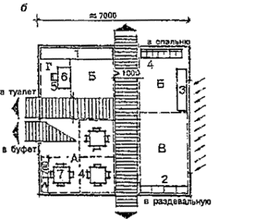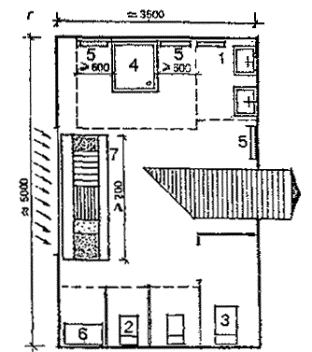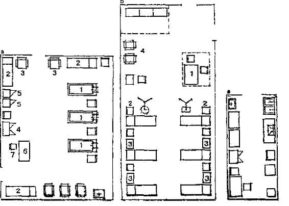 Рис. 22. Реабилитационные помещения медицинского назначения а - двухместная палата-бокс; б - палаты изолятора (1 - одноместная, 2 - двухместная) · Физиотерапевтический кабинет предусматривается в адаптируемых учебно-воспитательных учреждениях и во всех типах специализированных учреждений. В соответствии с профилем учреждения в кабинете должны быть предусмотрены зоны для электро-, свето-, теплолечения, УВЧ-, УЗИ-, микроволновой терапии, парафинолечения. Размер кабинета определяется исходя из 6 м2 площади на аппарат, но не менее 18 м2; в спецшколах-интернатах для детей с нарушениями зрения, ДЦП, последствиями полиомиелита - не менее 36 м2 (18 + 18). В домах-интернатах для детей с нарушением интеллекта применение закрытых кабин и экранов запрещается. При кабинете целесообразно предусмотреть комнату отдыха - раздевальную площадью не менее 12 м2 (рис. 23). Рис. 23. Реабилитационные помещения медицинского назначения а - водолечебница: 1 - ванна процедурная; 2 - кушетка медицинская; 3 - кресло; 4 - шкаф медицинский; 5 - тумбочка прикроватная; 6 - рабочее место врача; 7 - стул рабочий б - физиотерапевтический кабинет: 1 - рабочее место процедурной медсестры; 2 - зона размещения стационарных аппаратов для УФ- и теплового облучения; 3 - зона размещения переносных портативных аппаратов для электрофореза, УВЧ-, УЗИ-терапии, теплолечения (лампа «Соллюкс» и т. д.; 4 - зона отдыха после процедур; в - комната подготовки процедур · Для организации группового профилактического УФ-облучения размер физиотерапевтического кабинета (фотария) принимается в зависимости от мощности облучателя, определяющей расстояние до пациента. При наличии облучателя УГД-3 с лампами ДРТ-1000 (ПРК-7) площадь фотария должна быть не менее 45-50 м2; УГД-2 с лампами ДРТ-375 (ПРК-2) - 16-25 м2. · При фотарии должна быть предусмотрена комната для раздевания и отдыха. Рабочее место медсестры оборудуется вне фотария и обеспечивается звуковой сигнализацией. · Глубина ванны в кабинете подводного массажа должна быть не менее 40-60 см. По периметру ванна снабжена опорными скобами или поручнями. Вокруг ванны предусматривается пространство для прохода и проезда инвалидной коляски не менее 1,5-1,6 м. Пол вокруг ванны покрывается резиновым покрытием. · При кабинете с ванной предусматривается раздевальная - комната отдыха, уборная (рис. 24).