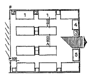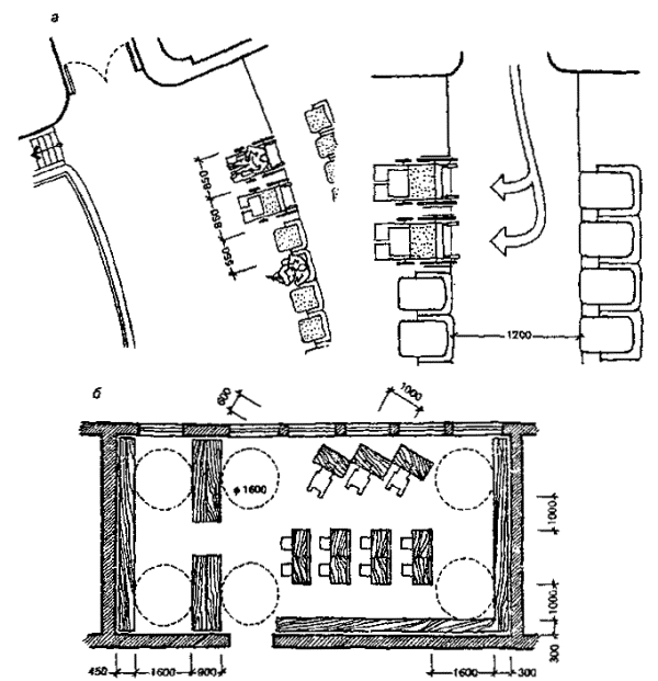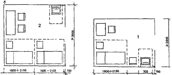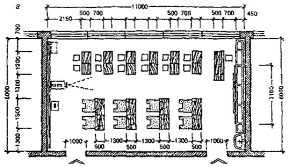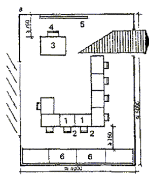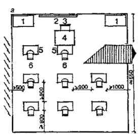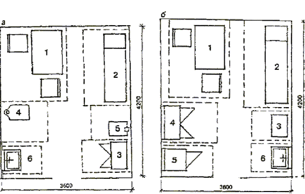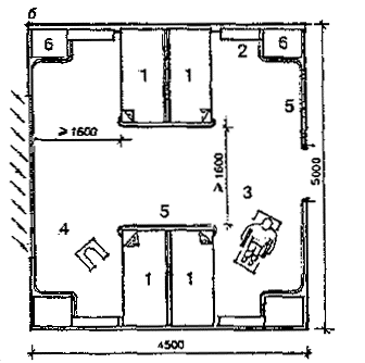 Рис. 14. Оборудование спален на 4 места для детей-инвалидов с различными нарушениями а - спальня для детей с нарушением слуха и зрения: 1 - тумба прикроватная; 2 - кровать детская; 3 - шкаф для одежды; 4 - стул; 5 - коврик б - спальня для детей с нарушением ОДА: 1 - кровать детская специальная; 2 - полка настенная; 3 - кресло-коляска; 4 - ходилки; 5 - поручни; 6 - тумбочка · Спальни для мальчиков и девочек проектируются раздельно, независимо от возраста учащихся. Спальни для мальчиков и девочек младшего школьного возраста входят в состав учебно-жилой ячейки одного класса. · Классы для занятий младших школьников должны оборудоваться одноместными столами. В классах для занятий детей с нарушением слуха, зрения, интеллекта расстояние между рядами столов должно быть не менее 600 мм, между столами - не менее 500 мм, ширина прохода между стеной и рядом столов - не менее 700 мм (рис. 15). · В классах необходимо предусматривать свободную зону для проведения игровых пауз во время урока. · Для детей с нарушением зрения на столах необходимо предусматривать индивидуальное рабочее освещение. · Для детей с нарушением слуха к столам должна подключаться сурдотехническая аппаратура. · В классе для занятий детей, пользующихся при ходьбе приспособлениями или креслами-колясками, должно предусматриваться жесткое крепление столов к полу. · Расстояние между столами и проходы должны быть не менее 850 мм. Для проезда и разворота кресла-коляски необходимо обеспечить проходы шириной не менее 1250 мм и разворотную площадку габаритом 1600 ´ 1600 мм. Жилая ячейка для старших школьников · В состав помещений жилой ячейки для старших школьников входят: гардероб-раздевальная, комната для сушки одежды, комната отдыха, спальни, комната для индивидуальных занятий, санитарный узел, комната для чистки и глажения одежды, комната воспитателя с кладовой личных вещей детей (рис. 13, б). · Рекомендуемый состав и площади помещений жилых ячеек для старших школьников даны в табл. 5. Таблица 5