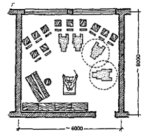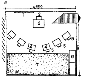 Рис. 11. Оборудование помещений групповой ячейки, адаптированной для посещения детьми-инвалидами дошкольного возраста а - раздевальная дошкольной группы на 10 детей: 1 - шкаф для одежды детей; 2 - скамья для переодевания; 3 - шкаф для одежды персонала; 4 - стул; 5 - туалетный столик с зеркалом; 6 - информационный стенд б - игровая дошкольной группы на 10 детей: 1 - шкаф для хранения пособий; 2 - шкаф для хранения игрушек; 3 - подоконный ленточный стол; 4 - стул детский; 5 - стул воспитателя; 6 - стол воспитателя; 7 - стол детский в - спальня дошкольной группы на 10 детей: 1 - кровать детская; 2 - стул детский; 3 - стул воспитателя; 4 - шкаф для белья; 5 - шкаф для индивидуальных комплектов одежды г - туалетная в групповой ячейке для дошкольников: 1 - умывальник детский; 2 - унитаз детский; 3 - унитаз взрослый; 4 - душевой поддон; 5 - вешалка для полотенец; 6 - хозяйственный шкаф; 7 - ножной душ с фактурной дорожкой · Помещение для детей с нарушением ОДА оборудуется одноместными столами, доской и шкафом для пособий. Вдоль свободных участков стен должен предусматриваться опорный поручень на высоте 500 мм от уровня пола. Диаметр поручня 35-50 мм. Мебель жестко крепится к полу. Помещение рассчитано на 8 детей (рис. 12, а). · Расстояния - проходы между столами для занятий должны быть не менее 900 мм, расстояние от столов до окна - не менее 500 мм, у противоположной стены - 1000 мм. При входе в помещение необходимо свободное пространство для разворота и разъезда кресел-колясок площадью не менее 1500 ´ 1500 мм. · В помещении для специальных занятий с детьми, имеющими нарушения интеллекта, проводится коррекционно-воспитательная работа по формированию у детей элементарных математических представлений, развитию речи, изобразительной деятельности, восприятия, мышления для возможно более полного восстановления их нервно-психической деятельности и подготовки к обучению во вспомогательной школе. Помещение для занятий должно оборудоваться только одноместными столами. Рекомендуется выделять зону для игровых форм занятий. Размещение столов должно иметь свободный характер (рис. 12, б). · Комната для специальных занятий с детьми, имеющими нарушения слуха (рис. 12, в), размещается в составе групповой ячейки и предназначена для систематически проводимого специального обучения, использующего сурдотехническую аппаратуру и направленного на сохранение и развитие остаточного слуха, а также формирование словесной речи на основе всех сохраненных анализаторов (зрительного, тактильно-вибрационного). Стены и потолок комнаты должны быть отделаны акустической плиткой. В кабинете радиотехники с местами для аудиологических исследований детей должна быть обеспечена воздушная и ударная звукоизоляция. · В помещении спецзанятий с детьми-инвалидами по зрению необходимо обеспечить левостороннее естественное освещение столов. Применение двухместных столов исключается, причем каждый стол должен иметь свободный доступ. В помещении следует устанавливать умывальник с подводкой теплой воды (рис. 12, г). Рис. 12. Оборудование помещений для специальных занятий в дошкольных учреждениях, посещаемых детьми-инвалидами а - помещение спецзанятий для детей с нарушением ОДА: 1 - шкаф для пособий; 2 - доска грифельная; 3 - стул воспитателя; 4 - стол воспитателя; 5 - стол детский стационарный; 6 - стул детский б - помещение спецзанятий для детей 