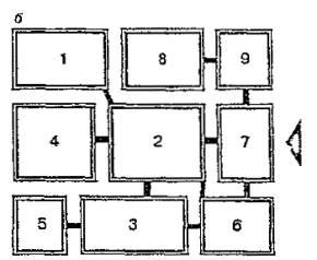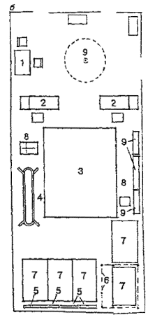 Рис. 24. Реабилитационные помещения медицинского назначения а - кабинет для подводного массажа: 1 - массажная ванна; 2 - раздевальная - комната отдыха; 3 - туалетная; 4 - кушетка медицинская; 5 - рабочее место процедурной медсестры; 6 - аппарат передвижной для подводного массажа; 7 - шкаф медицинский; 8 - стеллаж универсальный б - зал лечебной физкультуры: 1 - рабочее место персонала; 2 - массажная кушетка; 3 - зона для занятий гимнастикой; 4 - брусья; 5 - шведская стенка; 6 - гимнастический комплекс; 7 - маты гимнастические; 8 - зона размещений индивидуальных тренажеров и пр. оборудования; 9 - маячная установка для УФ-облучения группы детей · Зал лечебной физкультуры и механотерапии (не менее 72 м2) или комплекс кабинетов ЛФК (не менее 24 ´ 3 м) должен размещаться смежно с комнатой массажа (не менее 12 м2). Зал ЛФК должен быть приспособлен для занятий гимнастикой, лазания, занятий на снарядах, индивидуальных тренажерах, игры в мяч. При зале необходимо предусмотреть кладовую для хранения инвентаря (не менее 6 м2), туалет для детей (не менее 6 м2), комнату персонала с туалетной и душем (не менее 10 м2). Зал лечебной физкультуры может быть совмещен с фотарием. В этом случае на него распространяются требования, предъявляемые к фотарию. Учебно-производственные мастерские · Производственные мастерские в адаптируемых школах общего типа должны проектироваться с учетом возможности обучения в них учащихся-инвалидов с нарушением ОДА. В связи с этим все помещения мастерских следует оборудовать, соблюдая необходимую ширину проходов и проездов для свободного передвижения инвалидов, пользующихся креслами-колясками и другими вспомогательными средствами передвижения. Минимальная ширина проходов вдоль стены и между станками - 1000 мм; ширина прохода с возможностью разворота кресла-коляски - 1500 мм. · В мастерских и цехах, адаптированных к обучению инвалидов, рекомендуется организовать специально оборудованные для них рабочие места - 2-3 по каждому профилю обучения. · Ширина коридоров в адаптируемом блоке учебно-производственных мастерских должна быть не менее 1800 мм в свету, что обеспечивает беспрепятственное двухстороннее движение детей-инвалидов на креслах-колясках. Если ширина коридора менее 1800 мм, следует через каждые 6 м длины коммуникации устраивать расширенные зоны. · Учебно-производственные мастерские в специализированных школах для детей-инвалидов должны размещаться в отдельном блоке, иметь удобную связь с учебными и жилыми помещениями школьников среднего и старшего возраста, а также иметь выход на участок. · Площадь мастерской трудового обучения и общественно-полезного труда для учащихся младших классов определяется из расчета не менее 2 м2 на 1 учащегося а спецшколах для детей с нарушениями слуха, интеллекта и не менее 2,5 м2 - для детей с нарушениями зрения, последствиями полиомиелита и церебральных параличей. · Площадь учебных мастерских для учащихся средних и старших классов, приходящуюся на 1 место, следует принимать не менее: мастерской по обработке металла и древесины - 4,5 м2; комбинированной мастерской по обработке металла и древесины - 4,5 м2, мастерской по обработке тканей и по кулинарии - 5,5 м2, кабинета профессиональной ориентации - 3 м2 в спецшколах-интернатах с нарушениями слуха и интеллекта и 3,5 м2 - для детей с нарушением зрения и последствиями полиомиелита 