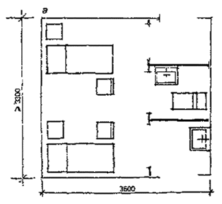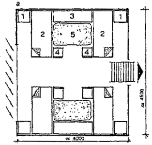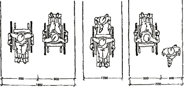 · Спальни для детей младшего возраста рекомендуется проектировать на 4 и 2 места (рис. 14). Площадь спальни на 1 ребенка с нарушением слуха, зрения или интеллекта должна быть не менее 4 м2. Площадь спальни на 1 ребенка с нарушением опорно-двигательного аппарата должна быть не менее 4,5 м2. · Спальни для детей, пользующихся при передвижении приспособлениями и креслами-колясками, должны оборудоваться таким образом, чтобы выделить индивидуальную зону каждому ребенку. Вдоль открытых участков стен и проходов необходима установка поручней.