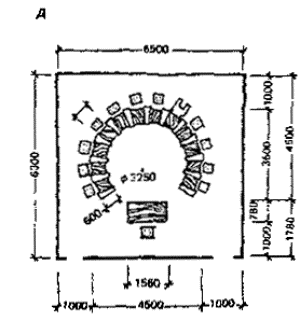 Рис. 15. Оборудование учебных помещений для детей-инвалидов а - класс для младших школьников с нарушением слуха, зрения и интеллекта: 1 - стол ученический одноместный; 2 - стул детский; 3 - шкаф для учебных пособий; 4 - стол учителя; 5 - телевизор; 6 - доска; 7 - место для игровых пауз б - учебный класс для детей с нарушением ОДА: 1 - стол ученический специальный; 2 - стул; 3 - кресло-коляска; 4 - стол учителя; 5 - телевизор; 6 - доска; 7 - шкаф для учебных пособий · Спальни рекомендуется проектировать не более чем на 4-5 чел. Площадь спальни для детей с нарушением слуха, зрения, интеллекта должна быть не менее 4,5 м2 на 1 место, для детей с нарушением опорно-двигательного аппарата - 5 м2. · Жилые помещения для каждой группы умственно отсталых детей рекомендуется проектировать по принципу групповых ячеек детских дошкольных учреждений. · Для обучения умственно отсталых детей, передвигающихся с помощью приспособлений и кресел-колясок, помещения для проживания должны проектироваться в виде учебно-жилых ячеек с классом для занятий. · При помещениях жилых ячеек для воспитанников, пользующихся при ходьбе приспособлениями, необходимы лоджии и веранды. · Помещения для необучаемых лежачих умственно отсталых детей должны проектироваться по принципу больничной палаты. Число детей в одной палате - не больше 8 чел., площадь на 1 воспитанника - не менее 6 м2. При палате должен быть санитарный блок площадью не менее 12 м2. УЧЕБНЫЕ ПОМЕЩЕНИЯ· В классах, кабинетах, лабораториях, мастерских адаптируемых школ общего типа необходимо предусмотреть возможность организации специально оборудованного места для занятий детей-инвалидов на креслах-колясках или пользующихся другими дополнительными средствами передвижения. Минимальный размер зоны на одно место с учетом подъезда и разворота коляски равен 1800 ´ 1800 мм (рис. 16). · Состав учебных кабинетов специальных учебных заведений должен определяться на основе программы обучения, числа классов-потоков и учебных часов. · Габариты и конфигурация учебных кабинетов должны обеспечивать благоприятные условия для зрительной работы учащихся, а также условия для правильной организации педагогического процесса. · Площадь учебных кабинетов родного языка, литературы, математики, истории, географии на 1 учащегося с нарушением слуха и интеллекта следует принимать не менее 2,5 м2; для детей с нарушением зрения и опорно-двигательного аппарата - не менее 3 м2. При кабинетах должны предусматриваться лаборантские площадью не менее 16 м2. · Площади учебных кабинетов информатики, электротехники и радиотехники следует принимать из расчета не менее 4,5 м2 на 1 учащегося с нарушением слуха и интеллекта и не менее 5 м2 для детей с нарушением опорно-двигательного аппарата. При кабинетах должны предусматриваться лаборантские площадью не менее 18 м2. Площади лабораторий физики, химии, биологии, кабинета черчения и рисования принимаются из расчета не менее 3 м2 на 1 учащегося в спецшколах-интернатах для детей с нарушением слуха и интеллекта и не менее 3,5 м2 - для детей с последствиями полиомиелита и церебральных параличей. Площадь лаборантских при них не менее 18 м2, а при лаборатории биологии - две лаборантские не менее чем по 18 м2 каждая.