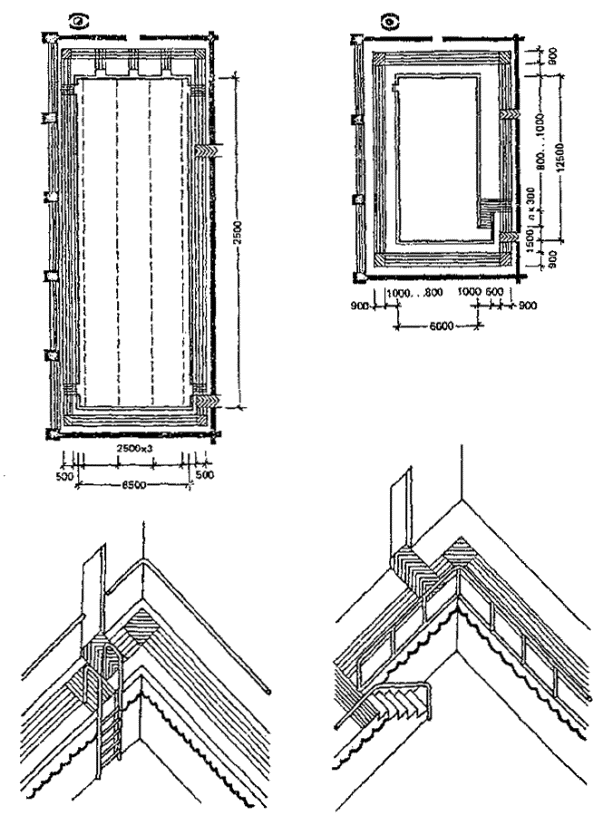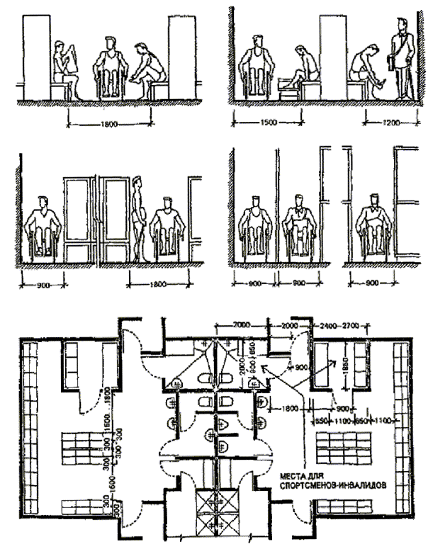 Рис. 16. Оборудование помещений для занятий в адаптируемых и вновь проектируемых зданиях, посещаемых детьми-инвалидами а - класс; б - лаборатория; в - студия рисунка и живописи; г - музыкальные классы; д - помещение для занятий; е - индивидуальное учебное место · Помещения для музыкальных занятий, занятий живописью и рисунком, посещаемые детьми-инвалидами, следует рассчитывать не более чем на половину класса в адаптируемых школах общего типа; в специализированных школах в этих помещениях должно приходиться не менее 4 м2 на 1 учащегося (рис. 16, в-е). · Размеры рекреационных помещений для детей среднего и старшего возраста следует принимать из расчета не менее 1,2 м2 на 1 учащегося. В учебно-жилых ячейках для детей младшего школьного возраста в качестве рекреационных помещений допускается использовать комнаты дневного пребывания. · В рекреациях, вестибюлях и холлах школ общего типа, адаптируемых к обучению инвалидов, рекомендуется предусматривать специальную зону для отдыха детей-инвалидов, располагающуюся в стороне от потоков других детей. Размеры организуемой зоны следует предусматривать на 2-3 учащихся из расчета 900 ´ 1200 мм на одного. ЗАЛЫ ДЛЯ ФИЗКУЛЬТУРНЫХ И СПОРТИВНЫХ ЗАНЯТИЙ, БАССЕЙНЫ, РАЗДЕВАЛЬНЫЕ· В учебно-воспитательных учреждениях общего типа, адаптируемых к посещению детьми-инвалидами, а также в специализированных учреждениях в целях комфортности обслуживания рекомендуется размещение всех основных и вспомогательных помещений на одном уровне (этаже). Если такое архитектурное решение невозможно, то все внутренние лестницы должны быть дублированы пандусами и лифтами. В физкультурном зале адаптируемых общеобразовательных школ следует предусматривать «мягкую стену» для защиты от травматизма расторможенных и слабовидящих детей. · В физкультурном зале и помещении с ванной бассейна следует предусматривать безопасную зону зрительских мест для учащихся инвалидов на креслах-колясках из расчета 900 ´ 1200 мм на одно место. Зона должна быть рассчитана не менее чем на 2-3 места. · Для организации учебно-тренировочных занятий по игровым видам спорта для инвалидов следует предусматривать зал размером не менее 36 ´ 18 м. Если программа занятий не включает баскетбол на колясках, то размеры зала могут быть 30 ´ 18 м. · Ванна бассейна должна быть оборудована с учетом специальных требований эксплуатации для детей-инвалидов. · В адаптированных к потребностям инвалидов помещениях плавательного бассейна поверхность проходных ножных ванночек должна быть ровной, нескользкой и блестящей. Фактура поверхности должна меняться при выходе к обходной дорожке плавательного бассейна. · Ширина обходной дорожки адаптированного плавательного бассейна должна быть не менее 2000 мм. На обходных дорожках желательно выделять специальные места для хранения кресел-колясок и других вспомогательных средств координации. · Вокруг ванны бассейна, которым пользуются дети-инвалиды, обязательно должны быть сделаны бортики (рис. 17). Рис. 17. Оборудование ванн бассейнов, посещаемых детьми-инвалидами · Для занятий инвалидов в плавательном бассейне обязательным условием является наличие двух ванн: для плавания и для обучения плаванию. · По пути движения инвалидов из раздевальных в помещение с ванной бассейна и физкультурно-спортивный зал должны быть установлены опо