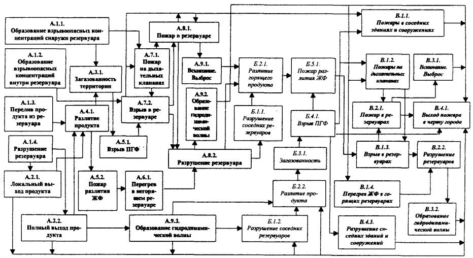 Рис. 1.2. Схема вероятных сценариев развития пожара в резервуарном парке Пожары подразделяются на следующие уровни: первый (А) - возникновение и развитие пожара в одном резервуаре без влияния на соседние; второй (Б) - распространение пожара в пределах одной группы; третий (В) - развитие пожара с возможным разрушением горящего и соседних с ним резервуаров, переходом его на соседние группы резервуаров и за пределы резервуарного парка. 1.2.3. На резервуарах с плавающей крышей в результате теплового воздействия локального очага горения происходит разрушение герметизирующего затвора, а полная потеря плавучих свойств и затопление крыши в реальных условиях может произойти через один час. При низком уровне нефтепродукта, когда горение происходит под понтоном или плавающей крышей, условия тушения пожара усложняются. Проникновению пены на свободную поверхность нефтепродукта препятствуют корпус понтона (плавающей крыши) и элементы герметизирующего затвора. 1.2.4. В железобетонном резервуаре в результате взрыва происходит разрушение части покрытия. Горение на участке образовавшегося проема сопровождается обогревом железобетонных конструкций покрытия. Через 20-30 мин возможно обрушение конструкций и увеличение площади пожара. 1.2.5. Развитие пожара в обваловании характеризуется скоростью распространения пламени по разлитому нефтепродукту, которая составляет для жидкости, имеющей температуру ниже температуры вспышки, - 0,05 м×с-1, а при температуре жидкости выше температуры вспышки - более 0,5 м×с-1. После 10-15 мин воздействия пламени происходит потеря несущей способности маршевых лестниц, выход из строя узлов управления коренными задвижками и хлопушами, разгерметизация фланцевых соединений, нарушение целостности конструкции резервуара, возможен взрыв в резервуаре. 1.2.6. Одним из наиболее важных параметров, характеризующих развитие пожара в резервуаре, является его тепловой режим. В зависимости от физико-химических свойств горючих жидкостей возможен различный характер распределения температур в объеме жидкости. При горении керосина, дизельного топлива, индивидуальных жидкостей значение температуры; экспоненциально снижается от температуры кипения на поверхности до температуры хранения в глубинных слоях. Характер кривой распределения температуры горючей жидкости изменяется с увеличением времени горения [11, 12]. При горении мазута, нефти, некоторых видов газового конденсата и бензина в горючем образуется прогретый до температуры кипения топлива гомотермический слой [11, 12], увеличивающийся с течением времени. Линейные скорости выгорания и прогрева нефти и нефтепродуктов во многом зависят от скорости ветра, обводненности продукта, характера обрушения крыши, организации охлаждения стенок резервуара. Значения скоростей выгорания и прогрева горючих жидкостей, необходимые для проведения расчетов, приведены в табл. 1.1. С увеличением скорости ветра до 8-10 м×с-1 скорость выгорания горючей жидкости возрастает на 30-50 %. Сырая нефть и мазут, содержащие эмульсионную воду, могут выгорать с большей скоростью, чем указано в табл. 1.1. Накопление тепловой энергии в горючем оказывает значительное влияние на увеличение расходов пенных средств. Кроме того, увеличение времени свободного развития пожара повышает опасность его распространения на сос