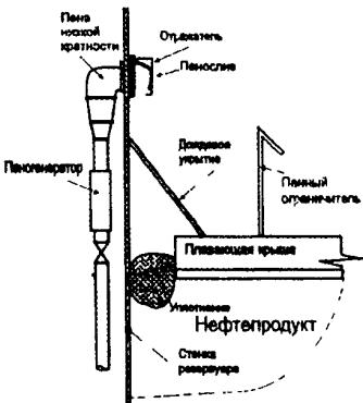 Рис. 7. Защита резервуара пеногенераторами низкократной пены, стационарно размещаемыми на плавающей крыше. Раствор пенообразователя подается вверх по эластичному рукаву