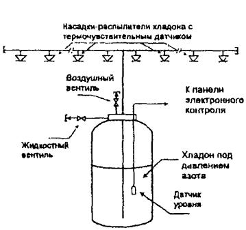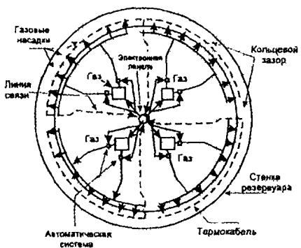 Рис. 9. Принципиальная схема расположения датчиков-распылителей и емкости с хладоном в автономной системе газового тушения пожара в кольцевом зазоре резервуара с плавающей крышей