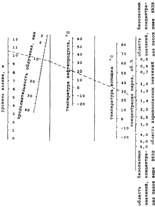 где Ст - расход воды, л×с-1; dH - наружный диаметр рукава, мм; К - коэффициент теплопередачи, Вт×м-2×К-1; рв - плотность жидкости, кг×м-3; Срв - удельная теплоемкость жидкости, Дж×кг-1×К-1. ПРИЛОЖЕНИЕ 7ПРОГНОЗИРОВАНИЕ РАЗВИТИЯ ПОЖАРА В РЕЗЕРВУАРНОЙ ГРУППЕ ОТ ЛУЧИСТОЙ ЭНЕРГИИ ФАКЕЛА ПЛАМЕНИ Прогнозирование выполняют при разработке оперативных планов пожаротушения для оценки максимально допустимого времени ввода сил и средств и первоочередного охлаждения резервуаров, расположенных рядом с горящим, с целью предотвращения возможности взрыва в паровоздушном пространстве или факельного горения паровоздушной смеси, выходящей из мест сообщения газового пространства облучаемого резервуара с атмосферой. Результаты оценки справедливы для группы однотипных резервуаров при горении жидкости на всей свободной поверхности резервуара в условиях штиля. Методика прогноза включает два этапа. На первом определяют максимально допустимое время введения сил и средств на охлаждение из условий предотвращения опасности нагрева элементов конструкции облучаемого резервуара выше температуры самовоспламенения паров нефтепродуктов. На втором этапе по взрывоопасности среды в облучаемом резервуаре определяют первоочередность введения стволов для охлаждения резервуаров, особенно при недостатке сил и средств начальной стадии пожара. Продолжительность нагрева наиболее теплонапряженного элемента конструкции соседнего с горящим резервуара до температуры самовоспламенения паров нефтепродукта можно оценить по номограмме (рис. 1). Ключ к пользованию номограммой состоит в следующем. Из точки, соответствующей температуре окружающей среды, проводят направляющий луч через шкалу "Отношение расстояния между резервуарами к диаметру горящего" и определяют длительность нагрева стенки до температуры самовоспламенения. Пример пользования номограммой показан на рис. 1 штрих-пунктиром при следующих исходных данных: температура окружающего воздуха 0 °С; отношение расстояния между резервуарами к диаметру горящего составляет 0,45. Из точки, соответствующей температуре окружающей среды (0 °С), проводим направляющий луч "X", который пересекает шкалу "Отношение расстояния между резервуарами к диаметру горящего" в точке, равной 0,45, и показывает на шкале "Критическое время" 11 мин. Делаем вывод о том, что с начала пожара до истечения 11 мин должны быть предприняты активные действия по охлаждению соседних резервуаров. Расчет номограмм выполнен при следующих условиях: опасная температура нагрева (176 °С) принята равной 0,8 температуры самовоспламенения для топлива ТС-1 (данный нефтепродукт имеет минимальную температуру самовоспламенения); интегральная плотность излучения при горении дизельного топлива в среднем составляет 73 кВт×м-2; толщина оболочки верхнего пояса резервуара РВС-5000 составляет 5 мм. Взрывоопасность среды в облучаемом резервуаре со стационарной крышей можно оценить по номограмме (рис. 2). Для пользования номограммой необходимо подготовить следующие исходные данные: уровень взлива нефтепродукта в соседних резервуарах; температуру нефтепродукта в негорящем резервуаре (принимают равной среднемесячной температуре окружающей среды); температуру вспышки нефтепродуктов. Пример пользования номограммой показан на рис. 2 штрих-пунктиром при следующих исхо