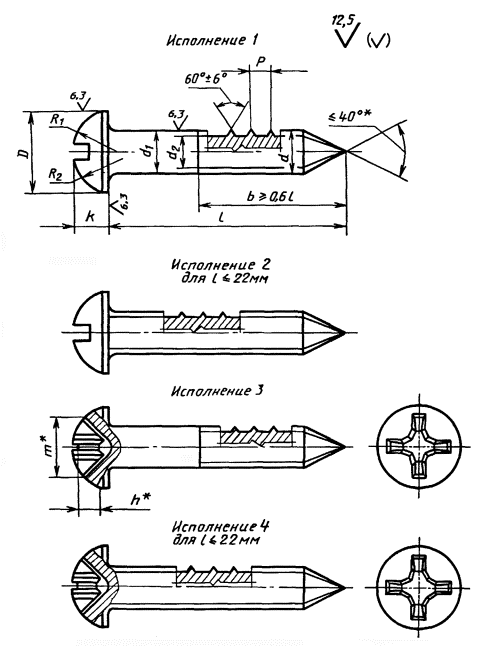 Дата введения 1982-01-01 Стандарт полностью соответствует CT СЭВ 2329. Требования настоящего стандарта являются обязательными. (Измененная редакция, Изм. № 1, 2). 2. Конструкция и размеры шурупов должны соответствовать указанным на чертеже и в табл. 1 и 2. __________________ * Размеры для справок. Таблица 1 мм