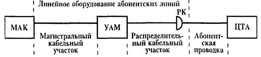 МАК - модуль абонентской концентрации; УАМ - удаленный абонентский модуль; ЦТА - цифровой телефонный аппарат; РК - абонентская распределительная коробка;  - место стыка