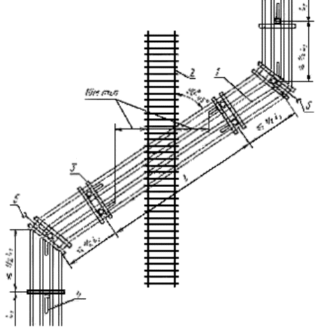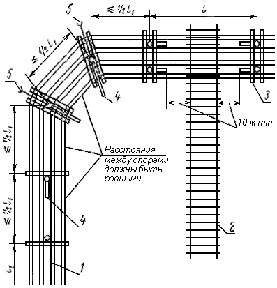 1 - линия ПВ; 2 - полотно трамвая или электрифицированной железной дороги постоянного тока или граница проезжей части дороги троллейбуса; 3 - переходная полуанкерная опора; 4 – подпора; 5 – оттяжка; l - пролет пересечения; l1 - пролет основной линии Для линий ПВ, подвешенных на стойках, установленных на крышах зданий, угол пересечения (в плане) с контактными сетями трамвая и троллейбуса допускается уменьшать до 30°. (Измененная редакция, Изм. № 1). 18. Нижние провода линий ПВ, пересекающие контактные сети (с учетом наихудших метеорологических условий для данной местности: гололед, изморозь или максимальная температура), должны располагаться в пролете пересечения на высоте: не менее 2 м над верхними проводами контактной сети электрифицированной железной дороги постоянного тока; не менее 8,0 м от головки рельса трамвая; не менее 10,5 м от уровня полотна дорожного покрытия троллейбуса. 19. Провода ПВ на опорах и стойках, ограничивающих пролет пересечения, должны иметь двойное крепление 20. В зависимости от типа линий длина пролета воздушного пересечения линии ПВ с контактными сетями электрифицированных железных дорог постоянного тока, трамваев и троллейбусов должна быть минимальная и не превышать величин, указанных в табл. 3. Таблица 3*