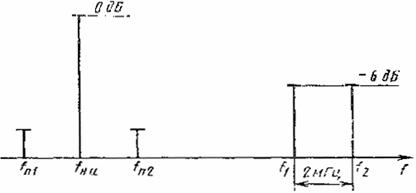 Черт. 9 Селективным микровольтметром (п. 4.1.5), подключенным к выходу абонентской розетки, измеряют напряжение несущей изображения Uн.и на частоте fн.и и напряжения помех Uп1 и Uп2 на частотах fн.и +2 МГц и fн.и -2 МГц соответственно. Отношение сигнала к помехе комбинационной частоты третьего порядка в сети с диапазонными или широкополосными усилителями, выраженное в децибелах, определяют по формуле