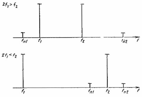 Черт. 10 На вход магистральной сети (после головной станции распределительной сети) от двух генераторов (п. 4.1.2) через согласующее устройство (п. 4.1.13.1) и соответствующий фильтр нижних частот (п. 4.1.12) подают в полосе пропускания усилителя немодулированные сигналы частотой f1 и f2, значения которых выбирают таким образом, чтобы помеха на частотах fп1=f1+f2 и fп2= f2-f1 также находились в полосе пропускания усилителя (черт. 11). Уровни обоих сигналов на входе магистральной сети устанавливают с помощью подключаемого к согласующему устройству (переключатель П в положении 1) селективного микровольтметра (п. 4.1.5) равными номинальному значению уровня радиосигнала изображения на выходе головной станции. Селективным микровольтметром (п. 4.1.5), подключенным к выходу абонентской розетки, измеряют напряжение сигнала U частотой f1 либо f2 и напряжения помех Uп1 и Uп2 на частотах fп1 и fп2 соответственно.