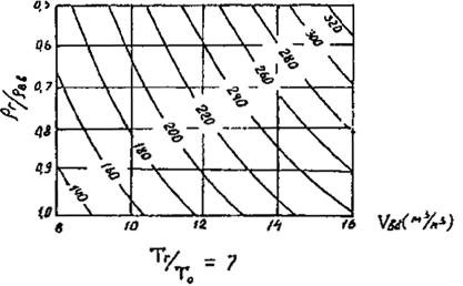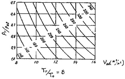 На рис. 4-5 изображены номограммы для определения длины факела (Lф), отнесенной к диаметру устья факельной установки (d), в зависимости от ТГ/То, VВВ и rВВ/rГ для четырех фиксированных значений TГ/То при диапазонах варьирования VВВ от 8 до 16 и rВВ/Рг от 0.5 до 1.0.