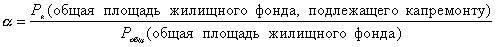 где: Зi - затраты на проведение комплексного капитального ремонта, а также капитального ремонта отдельных элементов здания в период между комплексными капитальными ремонтами i-ой группы жилищного фонда (на 1 кв. м общей площади жилья в год); Зобщ.i - общая площадь жилья i-ой группы жилищного фонда (тыс. кв. м); Пi - балансовая стоимость жилищного фонда i-ой группы (первоначальная с учетом переоценки) (тыс. руб.); a - доля общей площади жилья, подлежащего капитальному ремонту в планируемом году