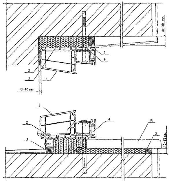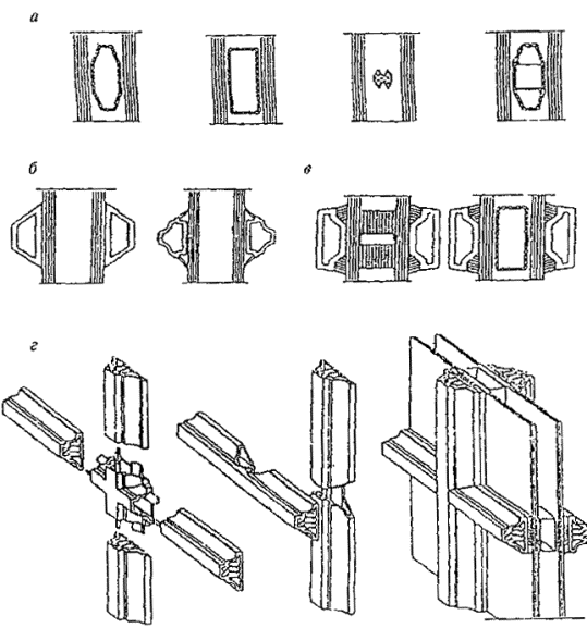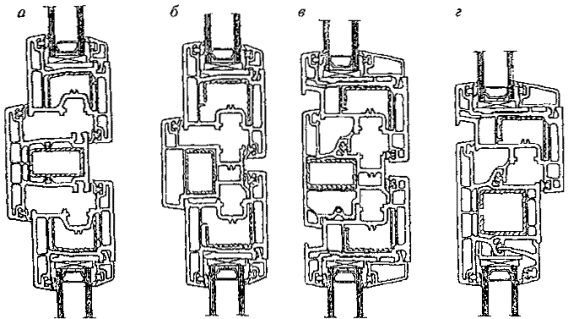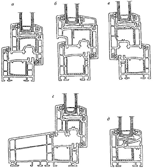 Пример условного обозначения - ОП В2 1840-1220 (4М1-16Аг-К4) ГОСТ 30674-99 - оконный блок из ПВХ профилей - ОП, класс изделия по показателю приведенного сопротивления теплопередаче - В2, высотой 1840 мм, шириной 1220 мм, с конструкцией стеклопакета: наружное стекло толщиной 4 мм марки М по ГОСТ 111, межстекольное расстояние 16 мм, заполненное аргоном, внутреннее стекло толщиной 4 мм с твердым теплоотражающим покрытием, в соответствии с настоящим стандартом. В случае применения изделий морозостойкого исполнения к обозначению вида изделия добавляют букву «М». При оформлении заказа на изготовление (поставку) индивидуальных изделий рекомендуется указывать вариант конструктивного решения, включая описание конструкции профилей и стеклопакетов, чертеж с указанием схемы открывания, типа оконных приборов, требования к внешнему виду и другие требования по согласованию изготовителя с заказчиком. 5 Технические требования5.1 Общие положения5.1.1 Изделия должны соответствовать требованиям настоящего стандарта, ГОСТ 23166 и изготавливаться по конструкторской и технологической документации, утвержденной в установленном порядке. Рекомендуемый состав документации на изготовление оконных блоков приведен в приложении Б. 5.1.2 Изделия состоят из рамочных элементов, сваренных из ПВХ профилей, усиленных стальными вкладышами. Импосты закрепляют в рамочных элементах при помощи механических соединений или сварки. Конструкция изделий (кроме предназначенных для неотапливаемых помещений) должна включать в себя не менее двух рядов уплотняющих прокладок в притворах. Примеры конструктивных решений основных узлов соединений (притворов) створок и коробок различных оконных систем приведены на рисунках 1-3. а - оконная система из трехкамерных профилей; б - оконная система с четырехкамерной створкой и трехкамерной коробкой (расположение наружных стенок створок и коробок в одной плоскости); в - оконная система из трехкамерных профилей (открывание наружу); г - оконная система из многокамерных профилей с расширенной коробкой; д - оконная система с остекленной коробкой Рисунок 1 - Узлы основных притворов с внутренним и наружным уплотнениями