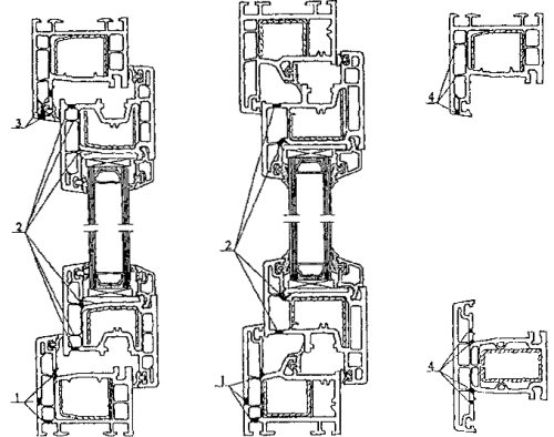 а, б - оконные системы из трехкамерных профилей со средним и внутренним уплотнениями; в - оконная система с четырехкамерной створкой и трехкамерной коробкой, с наружным, средним и внутренним уплотнениями; г - оконная система с многокамерной створкой и трехкамерной коробкой с наружным, средним и внутренним уплотнениями (расположение лицевых наружных стенок створок и коробок в одной плоскости); д - оконная система с четырехкамерными створкой и коробкой с наружным, средним и внутренним уплотнениями; е - оконная система с четырехкамерной створкой и многокамерной составной коробкой с наружным средним и внутренним уплотнениями Рисунок 2 - Узлы основных притворов с различными видами уплотнений а - импостной притвор оконной системы с наружным и внутренним уплотнениями; б - штульповой (безимпостный) притвор оконной системы с наружным и внутренним уплотнениями; в - штульповой (безимпостный) притвор оконной системы со средним и внутренним уплотнениями; г - импостный притвор неоткрывающихся и открывающихся элементов оконной системы со средним и внутренним уплотнениями Рисунок 3 - Узлы импостного и штульпового притворов 5.1.3 Конструкция изделий для жилых помещений должна предусматривать проветривание помещений при помощи форточек, фрамуг, створок с поворотно-откидным (откидным) регулируемым открыванием или вентиляционных клапанов. Для улучшения влажностного режима помещений рекомендуется применение в изделиях систем самовентиляции с помощью внутрипрофильных каналов, а также оконных блоков со встроенными регулируемыми и саморегулирующимися климатическими клапанами. Система внутрипрофильной канальной самовентиляции приведена в приложении В. Для повышения звукоизоляционных характеристик изделия в режиме проветривания в оконные блоки могут устанавливаться шумозащитные клапаны. 5.1.4 Требования настоящего стандарта распространяются на оконные блоки с площадью, не превышающей 6 м2, при максимальной площади каждого открывающегося элемента 2,5 м2 для изделий белого цвета и 2,2 м2 – для изделий других цветов. Расчетная масса створок (полотен) изделий белого цвета не должна превышать 80 кг, масса открывающихся элементов изделий других цветов - 60 кг. Изготовление оконных блоков (створок) с площадью и массой, превышающими указанные значения, должно быть подтверждено результатами лабораторных испытаний или дополнительными прочностными расчетами согласно действующим строительным нормам с учетом требований ГОСТ 23166. Допускаемое соотношение высоты и ширины открывающихся элементов конкретных марок изделий с учетом схемы открывания, типов применяемых профилей и оконных приборов, момента инерции усилительных вкладышей и веса створчатых элементов устанавливают в технической документации. 5.1.5 Изделия должны быть безопасными в эксплуатации и обслуживании. Условия безопасности применения изделий различных конструкций устанавливают в проектной документации (например, оконные блоки с подвесным открыванием створок не рекомендуется применять в детских учреждениях). Изделия должны быть рассчитаны на эксплуатационные нагрузки, включая ветровую нагрузку в соответствии с действующими строительными нормами. 5.1.6 Изделия (или материалы для их изготовления и комплектующие детали) должны иметь документы о санитарной безопасности, предусм