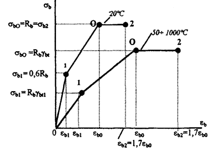 Приведенный коэффициент температуропроводности бетона вычисляют по формуле: где: l и С - расчетные средние коэффициенты теплопроводности и теплоемкости бетона, вычисляют для температуры 450 °С; W - весовая эксплуатационная влажность бетона, в кг/кг; r - плотность сухого бетона, кг/м3. Увеличение коэффициента теплоемкости на 50W связано с учетом расхода тепла на испарение свободной воды в порах бетона. 5.4. Диаграмма деформирования бетона состоит из трех линейных участков, соединяющих характерные базовые точки (Рис. 1). Первый участок диаграммы 0-1 характеризует упругую работу бетона до условного предела пропорциональности. На втором участке 1-О установлена связь между напряжениями и деформациями бетона от условного предела пропорциональности до предельного значения напряжения при однородном напряженном состоянии - при центральном сжатии (прямоугольная эпюра напряжений). Третий участок О-2 при постоянном значении напряжений, равном сопротивлению бетона сжатию Rb×gbt, характеризует изменение предельного значения деформаций бетона от однородного напряженного состояния до наибольшего значения при неоднородном напряженном состоянии (при треугольной эпюре деформаций) бетона. Рис. 1. Расчетная диаграмма деформирования бетона на сжатие при нагреве. Напряжения в основной базовой точке «О» диаграммы принимаются равными значению сопротивления бетона при центральном сжатии Rbgbt и соответствующей предельной деформации ebo. Предельную деформацию при центральном сжатии ebo в основной базовой точке «О» диаграммы деформирования бетона принимают по Табл. 4. При огневом воздействии сжатые элементы подвергаются неравномерному нагреву. Разрушение этих элементов происходит по более прочному, менее нагретому бетону, обладающему меньшей предельной деформацией. Поэтому предельная деформация сжатия бетона, приведенная в Табл. 4, должна приниматься по наименьшей температуре нагрева бетона в поперечном сечении элемента. Таблица 4.