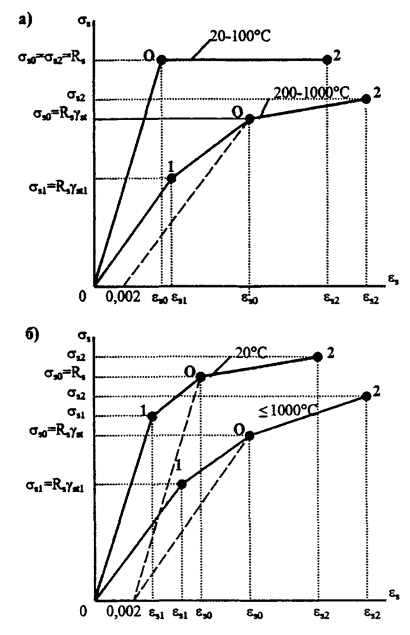 5.9. Диаграмма деформирования при растяжении и сжатии арматуры, имеющей физический предел текучести, состоит из двух прямолинейных участков, соединяющихся в основной базовой точке «О» (Рис. 2). Рис. 2. Расчетные диаграммы деформирования арматуры при нагреве: а) с физическим пределом текучести; б) с условным пределом текучести. Диаграмма деформирования арматуры с условным пределом текучести состоит из трех прямоугольных участков. Первый участок 0-1 диаграммы характеризует упругую работу арматуры до напряжения, принятого за предел пропорциональности. Второй участок 1-О описывает связь между напряжениями и деформациями до условного предела текучести Rsgst. Третий участок О-2 устанавливает связь между напряжениями и деформациями от условного предела текучести до временного сопротивления. Напряжение в основной базовой точке «О» диаграммы принимают равным значению сопротивления арматуры растяжению Rsgst при соответствующей деформации es0. Значение деформации в основной базовой точке диаграммы деформирования арматуры с физическим пределом текучести принимают равным:
