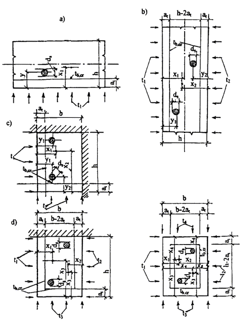 где: l - толщина прогрева слоя бетона в метрах; xi - расстояние в метрах от рассматриваемой точки бетона в сечении до i-ой обогреваемой поверхности; j1, j2 - коэффициенты, зависящие от плотности бетона, принимаются по Табл. 9; уi - расстояние в метрах от i-й обогреваемой поверхности до оси арматуры; ds - диаметр арматуры в метрах; t - длительность стандартного пожара, в мин. Время достижения предела огнестойкости в часах определяют по формуле: ОДНОСТОРОННИЙ НАГРЕВ6.7. Для плит, стен пренебрегают теплообменом на торцах и считают, что температура изменяется только по толщине, и решают одномерную задачу теплопроводности (Рис. 3). Рис. 3. Определение температуры бетона и арматуры, расположенных у обогреваемых поверхностей: а) одной, б) двух параллельных, с) двух перпендикулярных, d) трех, е) четырех. Температуру бетона и арматуры (°С) в плите при одной обогреваемой поверхности определяют по формуле: Формула (28) применима при хi£0,7h. В этой формуле r1 равно отношению условной толщины рассматриваемого слоя бетона хi* от обогреваемой поверхности к толщине прогреваемого слоя бетона l. Толщину слоя бетона, прогреваемого до критической температуры tb,cr (в °С), определяют по формуле: при tb,cr: х1 = at. В формулах (23 - 26, 30) приведенный коэффициент температуропроводности аred (м2/ч) вычисляют по формуле (6) или принимают по Табл. 8. 6.8. Толщину защитного слоя бетона от обогреваемой поверхности до оси арматуры определяют в зависимости от относительных расстояний r1 и y1. Значение r1 вычисляют по формуле (29). Значение y1 определяется по формуле: где l - находят по формуле (26). При критической температуре арматуры ts,cr y1 = а. ДВУХСТОРОННИЙ НАГРЕВ6.9. При двух параллельных обогреваемых поверхностях температуру бетона и арматуры следует определять: Относительное расстояние r1 определяют по формуле (29) и x1 £ 0,5h (См. Рис. 3) по формуле (30). Относительное расстояние r2 определяют также по формуле (29), принимая вместо x1 значение x2. Затем по формуле (32) определяют температуру бетона, отстоящего от обогреваемой поверхности на расстоянии x1 и x2 = h-x1. При температуре бетона, равной tb,cr, x1 = at. Таблица 9.