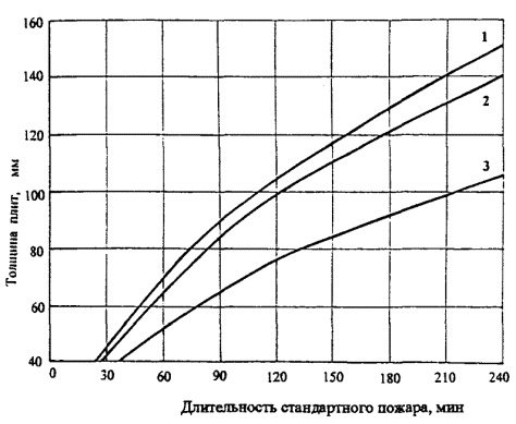 где: aс - коэффициент передачи тепла конвекцией на необогреваемой поверхности; ar - коэффициент передачи тепла излучением на необогреваемой поверхности. В расчет вводится среднее арифметическое из начального и конечного значений коэффициента теплоотдачи a. Начальное значение находят при повышении температуры на 1 °С необогреваемой поверхности. Конечное значение определяют при повышении температуры необогреваемой поверхности на 160 °С, т.е. при наступлении предела огнестойкости по потере теплоизолирующей способности. Затем теплотехническим расчетом находят время достижения предела огнестойкости по потере теплоизолирующей способности. 7.2. Предел огнестойкости по потере теплоизолирующей способности при одностороннем нагреве плит (стен) из тяжелого бетона на гранитном и известняковом заполнителях и конструкционного керамзитобетона при стандартном огневом воздействии приведен на Рис. 4. Рис. 4. Предел огнестойкости по теплоизолирующей способности плит (стен) при одностороннем нагреве из бетона: 1 - тяжелого на гранитном заполнителе; 2 - то же, на известняковом заполнителе; 3 - конструкционного керамзитобетона. 8. РАСЧЕТ ПРЕДЕЛА ОГНЕСТОЙКОСТИ ПО ПОТЕРЕ НЕСУЩЕЙ СПОСОБНОСТИБАЛОЧНЫЕ ПЛИТЫ8.1. Плиты считаются балочными, если