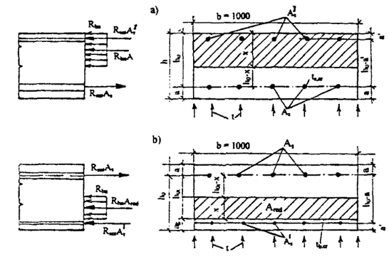 где: h01, Аs1, Rsn1… h0n, Asn, Rsn,n - рабочая высота сечения, площадь и нормативное сопротивление арматуры для каждого класса и ряда. Затем вычисляют средний коэффициент условий работы для всей арматуры по формуле: