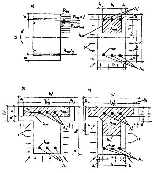 Напряжения в арматуре ssp определяют с учетом дополнительных потерь предварительного напряжения от огневого воздействия. ПРОЧНОСТЬ ИЗГИБАЕМЫХ ЭЛЕМЕНТОВ12.15. При расчете прочности изгибаемых элементов следует учитывать, что элементы, рассчитанные на работу в нормальных условиях по I-ому случаю x £ xh0, после пожара могут работать по 2-му случаю x > xh0t из-за уменьшения сжатой зоны бетона после прогрева наружных слоев бетона выше критической температуры. Глубина прогрева бетона до его критической температуры находится по Рис. 32 - 37. Прочность прямоугольных сечений с двойной арматурой (Рис. 6) определяют в зависимости от высоты сжатой зоны: по I-ому случаю при x £ xR из условия: по 2-му случаю при x > xR: и при х < 2а¢: Для прямоугольных сечений с одиночной арматурой в формулах (136 - 139) Аs¢ = 0. 12.16. Прочность изгибаемых элементов, имеющих полку в сжатой зоне, рассчитывают в зависимости от положения границы сжатой зоны. Если граница сжатой зоны проходит в полке (Рис. 6), то соблюдается условие: