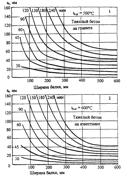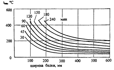 Примечание: 1. Для балок из конструкционного керамзитобетона минимальная ширина принимается такой же, как для балок из тяжелого бетона. Толщина защитного слоя для балок из конструкционного керамзитобетона указана в скобках. 2. Указанная ширина балки для ребристых плит соответствует ширине двух ребер. 8.12. Проверку расчетом предела огнестойкости балки производят в следующем порядке. Зная требуемый предел огнестойкости балки, по графикам (Рис. 32 - 37) находят температуру сжатой арматуры, принимая ее равной прогреву бетона на расстоянии от оси стержня до боковой грани сечения, приравнивая прогрев бетона боковой грани балки при h ³ 2b прогреву бетона в плите от нагреваемой поверхности. При этом высота плиты принимается равной 0,5b или меньше. По температуре сжатой арматуры находят коэффициент условий работы gst¢ по графикам на Рис. 22 - 24. По Рис. 32 - 37 находят глубину прогрева бетона at сжатой зоны до критической температуры tb,cr от боковой грани балки. Определяют приведенную ширину балки: При воздействии изгибающего момента от нормативной нагрузки по приведенной ширине балки bt и коэффициенте условий работы сжатой арматуры gst¢ находят относительную высоту сжатой зоны: Затем вычисляют коэффициент условий работы растянутой арматуры: Без больших погрешностей можно принять, что плечо внутренней пары сил в сечении при нагреве равно плечу внутренней пары сил до нагрева, тогда приближенный коэффициент условий работы растянутой арматуры можно определять по формуле:
