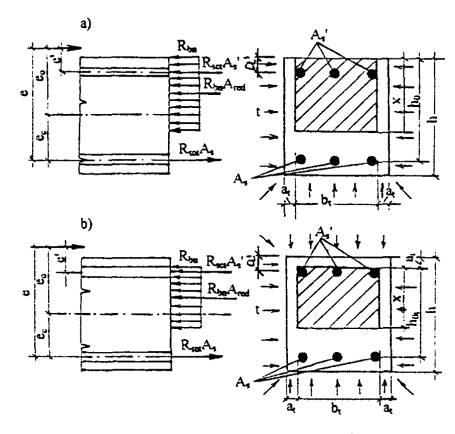 Примечание: 1. Колонна должна иметь гибкость l/b £25 и армирование не более 3 %. 2. Колонна, подвергаемая огневому воздействию с одной стороны, находится в стене, и нагреваемые поверхности колонны и стены расположены на одном уровне. 8.19. Огневое воздействие вызывает неравномерное распределение температур в бетоне по поперечному сечению колонны. Периферийные слои бетона прогреваются значительно больше, чем внутренние, что приводит к снижению прочности и сильному развитию деформаций бетона у краев сечения колонны. Менее нагретый бетон центральной части сечения обладает большей прочностью и меньшей деформативностью. Разрушение колонн происходит по менее нагретому, более прочному бетону, при деформации сжатия, близкой к предельной. В арматуре, расположенной у краев сечения колонны, при высоких температурах нагрева развиваются большие пластические деформации, и она перестает воспринимать усилия от внешней нагрузки, которые передаются на менее нагретый бетон в центральной части сечения колонны. 8.20. Расчет огнестойкости по потере несущей способности колонны должен производиться по предельному состоянию с учетом изменения механических свойств арматуры, прогрева бетона до критической температуры и гибкости колонны при огневом воздействии. Несущую способность сжатого элемента при нормативной продольной силе со случайным эксцентриситетом еa £ b/30 £ l/600 £ 1 см и l0 £ 20h определяют из условия: Несущую способность сжатых колонн со случайным эксцентриситетом, обогреваемых с одной, двух смежных и трех сторон, рассчитывают как внецентренно сжатые с малым эксцентриситетом. 8.21. Несущая способность внецентренно сжатого элемента прямоугольного сечения (Рис. 8) при x = x/h0 £ xR определяется из условия: При этом высоту сжатой зоны определяют из условия: Рис. 8. Схема усилий и эпюра напряжений в сечении, нормальном к продольной оси, внецентренно сжатого железобетонного элемента: а) - при трехстороннем, b) - при четырехстороннем обогреве при пожаре при расчете на огнестойкость. При x = x/h0 > xR несущую способность определяют из условия (80). При этом высоту сжатой зоны определяют по формуле: где: При четырехстороннем обогреве в первом слагаемом формулы (80) и в формуле (83) вместо h0 принимают h0t (См. п. 8.9). 8.22. Расстояние от сжимающей продольной силы до равнодействующей усилий в арматуре с учетом продольного изгиба определяют по формуле: где: e01 = M/N; еа - случайный эксцентриситет (См. п. 8.20); ес = (0,5h - а) - расстояние от центра тяжести бетонного сечения до центра тяжести продольной арматуры S¢; ft - дополнительный выгиб, вызванный неравномерным нагревом по высоте сечения элемента при одно-, двух- и трехстороннем огневом воздействии, вычисляют по формуле: