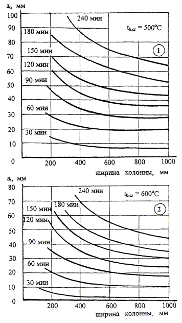 8.24. Для принятого по Табл. 1 времени огневого воздействия глубину прогрева бетона at до критической температуры tb,cr в прямоугольных колоннах принимают по Рис. 9 в зависимости от ширины и высоты колонны. Глубину прогрева бетона аt для колонны круглого сечения находят по Рис. 9, принимая d = 0,9b, и найденное значение аt умножают на коэффициент 1,11. Для колонн шириной 200, 300 и 400 мм температуру арматуры можно принимать по Приложению 5. Для колонн шириной 600 и более мм температуру арматуры допускается определять как для плит высотой 200 мм (Приложение 3), принимая температуру бетона на глубине прогрева равной толщине защитного слоя до оси арматуры для требуемого времени огневого воздействия. Рис. 9. Глубина прогрева аt до критической температуры тяжелого бетона на: 1 - гранитном, 2 - известняковом заполнителях в зависимости от ширины b квадратной колонны. 30 - 240 - длительность огневого воздействия по ИСО 834, мин. 8.25. Зная приведенную ширину колонны bt и температуру арматуры, по Рис. 22 - 24 находят значение коэффициента условий работы арматуры gst, и по формулам (79, 80) вычисляют усилие N, которое воспринимает сечение колонны при требуемом пределе огнестойкости. Если это усилие больше расчетного от нормативной нагрузки, то требуемый предел огнестойкости обеспечен. 8.26. Пределы огнестойкости колонн сечением 200´200, 300´300 и 400´400 мм из тяжелого бетона на гранитном и известняковом заполнителях, при проценте армирования сечений 1, 1,5 и 3 % с толщиной защитного слоя бетона до оси арматуры 3,5 см, при действии сжимающей силы со случайным эксцентриситетом и четырехстороннем огневом воздействии приведены в Приложении 6. 8.27. Косвенное армирование сетками или спиралями повышает предел огнестойкости в среднем на 20 %. Расчет огнестойкости колонн при косвенном армировании следует выполнять по формулам (80 - 82), подставляя в формулы вместо Rbn приведенную призменную прочность бетона Rb,red, определенную согласно СНиП 2.03.01-84* с учетом влияния нагрева от огневого воздействия на арматурную сталь сетки или спирали. НЕСУЩИЕ СТЕНЫ8.28. Несущие стены сплошного сечения с гибкостью l £ 83 (l0/ht £ 24) при одностороннем огневом воздействии и при платформенном опирании на жесткое основание (l0 » 0,7Н), когда продольная сжимающая сила приложена с начальным или случайным эксцентриситетом со стороны обогреваемой поверхности, работают на внецентренное сжатие. Предел огнестойкости по потере несущей способности наступает при прогибе стены, направленном в необогреваемую сторону. Прогиб от неравномерного нагрева стены по высоте сечения в расчете не учитывают, так как он направлен в обогреваемую сторону и уменьшает эксцентриситет приложения продольной сжимающей силы. 8.29. Минимальные размеры толщины стены «h» и толщины защитного слоя бетона до оси арматуры «а» даны в Табл. 16. Таблица 16.