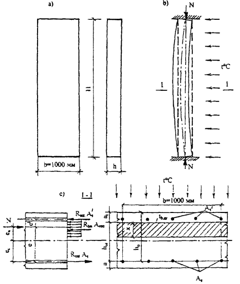 8.30. При одностороннем огневом воздействии и платформенном опирании стен на жесткое основание несущую способность внецентренно сжатых плоских элементов при приложении продольной силы с большим эксцентриситетом, когда x = x/h0t £ xR, определяют по формулам (80, 81). При действии продольной силы с малым эксцентриситетом, когда x = x/h0t > xR, несущую способность определяют по формулам (80 и 82) (Рис. 10). В формулах (80 - 82) значение bt = b = 100 см. Рис. 10. Стены с платформенным опиранием: а) основные расчетные размеры; в) схема разрушения при одностороннем огневом воздействии; с) схема сечения. 8.31. Для принятого предела огнестойкости по кривым прогрева бетона на Рис. 32 - 37 находят значение аt - глубину прогрева бетона до критической температуры и температуру нагрева арматуры по глубине прогрева бетона, равного глубине защитного слоя бетона до оси арматуры. Зная температуру нагрева сжатой арматуры, определяют коэффициент gst¢ по Рис. 22 - 24. По формуле (80) вычисляют усилие N, принимая эксцентриситет «е» по формуле (84) без ft. Если условие (80) соблюдено, то предел огнестойкости обеспечен. 8.32. Расчетный предел огнестойкости стен, вычисленный по формуле (27) при контактном опирании на упруго-податливое основание, при растворных швах проектной толщиной 20 мм умножается на коэффициент упругой податливости 0,75; при швах толщиной 5 мм, заполненных цементно-песчаной пастой - на коэффициент 0,85. 8.33. Пределы огнестойкости по потере несущей способности стен толщиной 100, 140 и 180 мм из тяжелого бетона классов В15, В25 и В35 даны в Приложении 6. 8.34. В условиях пожара строго симметричный двусторонний обогрев железобетонной стены не всегда возможен. Однако при нагревании железобетонной стены одновременно с двух сторон не возникает температурного прогиба, и стена продолжает работать на центральное сжатие, и поэтому ее предел огнестойкости возможно будет выше, чем при одностороннем нагреве. РАСТЯНУТЫЕ ЭЛЕМЕНТЫ8.35. В несущих конструкциях ферм и арок имеются элементы, работающие на растяжение со случайным эксцентриситетом, а также с малым и большим эксцентриситетами продольного усилия. Как правило, эти элементы во время пожара обогреваются со всех сторон. Для растянутых элементов минимальная ширина поперечного сечения b и расстояние до оси арматуры а приведены в Табл. 17. Эти данные относятся к растянутым элементам ферм и арок с ненапрягаемой и с преднапряженной арматурой, обогреваемым со всех сторон. Полная площадь поперечного сечения бетона элемента должна быть не менее 2b2. Таблица 17.
