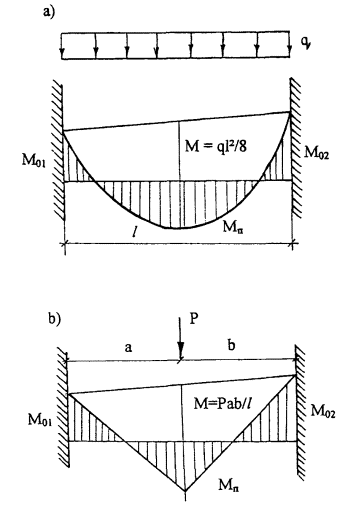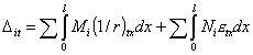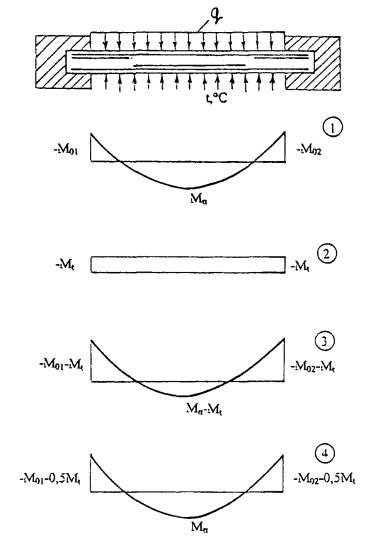 где: Mi и Ni - изгибающий момент и продольная сила в сечении x-элемента основной системы от действия в i-ом направлении соответствующей единичной силы; (1/r)tx, etx - температурные кривизна и удлинение х-элемента, вызванные огневым воздействием. Изгибающий момент от неравномерного нагрева по высоте сечения элемента, заделанного на опорах, а также в замкнутых рамах кольцевого, квадратного и прямоугольного очертаний, имеющих одинаковое сечение, определяют по формуле: