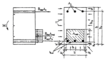 Rsсt = Rsс×gst - расчетное сопротивление арматуры сжатию; Rswt = Rsw×gst - расчетное сопротивление поперечной арматуры растяжению; Еbt = Еb×bb - модуль упругости бетона; Еst = Еs×bs - модуль упругости арматуры; gbt, gtt - коэффициенты условий работы бетона при сжатии и растяжении; gst = gst¢ - коэффициент условий работы арматуры при растяжении и сжатии; gst,cr - критическое значение коэффициента условий работы растянутой арматуры; bb, bs - коэффициенты, учитывающие изменения модулей упругости бетона и арматуры;