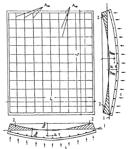 где: Аsx и Asy - площадь сечения арматуры в коротком 1x и длинном 1y пролетах плиты. Эта формула справедлива при Asx/Asy ³ 1,3. При меньших значениях, т.е. при Asx/Asy < 1,3 критическую температуру нагрева растянутой арматуры принимают равной 800 °С. При большей температуре нагрева растянутой арматуры в пролете плиты образуются сквозные трещины, и плита утрачивает огнепреграждающую способность, т.е. наступает предел огнестойкости плиты по нарушению ее целостности. Рис. 16. Схема работы плиты, свободно опертой по контуру, при огневом воздействии снизу: h0 - рабочая высота сечения до огневого воздействия; h0t - рабочая высота сечения при огневом воздействии; ц. т. - центр тяжести арматуры; 1 - нейтральная ось; 2 - сжатая зона бетона. 8.48. Для определения предела огнестойкости плит строят кривую изменения средней температуры арматуры, используя формулу: