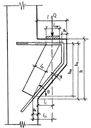 Примечание: Для промежуточных значений удельную меру ползучести принимают по интерполяции. При диаграммном методе расчета (См. п. 8.52) после пожара учитывают дополнительные напряжения сжатия, возникающие в арматуре от развития деформаций усадки в бетоне. Для этого к предельной деформации сжатия бетона eb0 следует прибавить деформацию укорочения от температурной усадки бетона менее нагретой части сечения ecs, которую определяют по формуле (151). Напряжения сжатия в арматуре от ползучести бетона при остывании не учитывают, так как пластические свойства бетона и арматуры учтены при построении их диаграмм деформирования. 12.19. После пожара прочность наклонных сечений изгибаемых железобетонных элементов следует определять по формулам (71 - 78), прочность нормальных сечений растянутых железобетонных элементов - по формулам (89 - 93), в которых нормативные сопротивления бетона и арматуры заменяются на расчетные сопротивления. ПРОЧНОСТЬ КОНСОЛЕЙ12.20. Консоли представляют собой выступ, массивность которого меньше самой колонны. При пожаре консоль омывается пламенем с боковых поверхностей и снизу, а иногда и сверху. Прогрев углов консоли происходит интенсивнее, и после пожара прочность консоли снижается больше, чем прочность колонны. Возрастает опасность среза консоли вследствие увеличения расстояния от точки приложения внешней силы до опорного сечения l1t > l1 (Рис. 20). Рис. 20. Схема для расчета короткой консоли после пожара. Расчет прочности короткой консоли, для которой l < 0,9h0, на действие поперечной силы для обеспечения прочности наклонной сжатой полосы между грузом и опорой производят из условия: