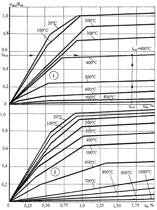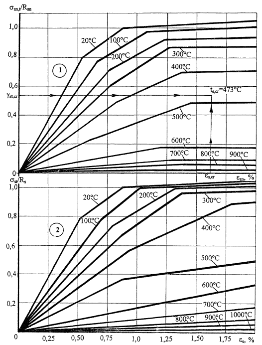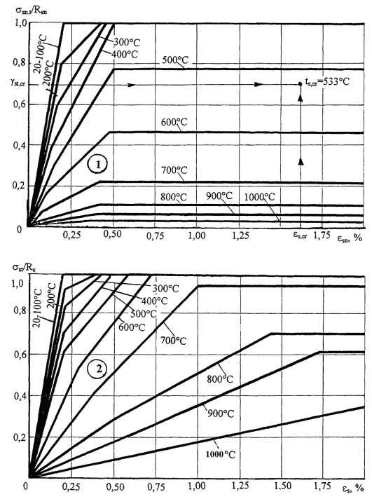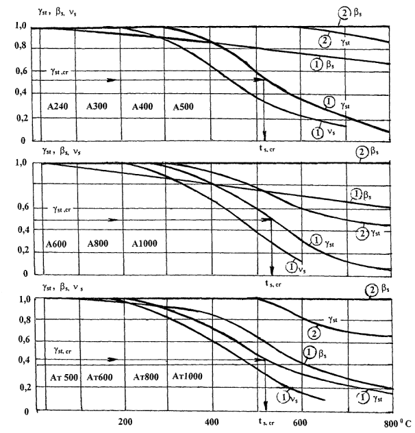 По значениям es,cr,m и gst,m и диаграммам деформирования арматуры (Рис. 28 - 31) находят критические температуры для каждого класса арматуры ts,cr1, ts,cr2... ts,cr,n. Затем вычисляют среднюю критическую температуру для арматуры разных классов: