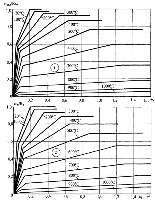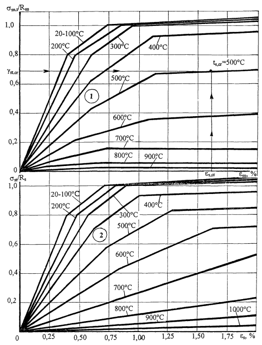 Рис. 23 Значения коэффициентов gst, bs и vs для арматуры классов В500, В 1500, Bp1500 1 - при пожаре; 2 - после пожара. Рис. 24 Значения коэффициента gs5,t для арматуры классов: 1 - А240, А300; 2 - А400, А500; 3 - А600, Ат600, А800, Ат800, А1000, Ат1000. ПРИЛОЖЕНИЕ 2ДИАГРАММЫ ДЕФОРМИРОВАНИЯ БЕТОНА И АРМАТУРЫ ПРИ ОГНЕВОМ ВОЗДЕЙСТВИИРис. 25. Диаграммы деформирования бетона на сжатие с гранитным заполнителем: 1 - при пожаре; 2 - после пожара.