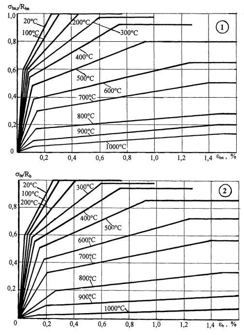Рис. 26. Диаграммы деформирования тяжелого бетона на сжатие с известняковым заполнителем: 1 - при пожаре, 2 - после пожара. Рис. 27. Диаграммы деформирования конструкционного керамзитобетона на сжатие: 1 - при пожаре, 2 - после пожара. Рис. 28. Диаграммы деформирования арматуры классов А240, А300 и А400: 1 - при пожаре, 2 - после пожара.