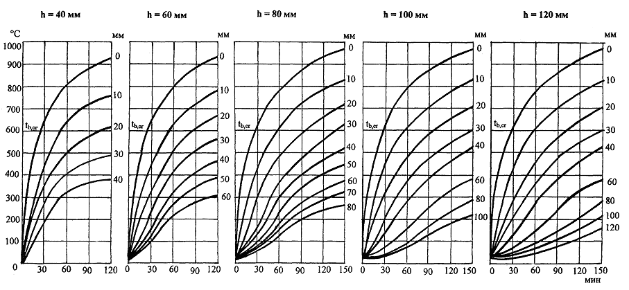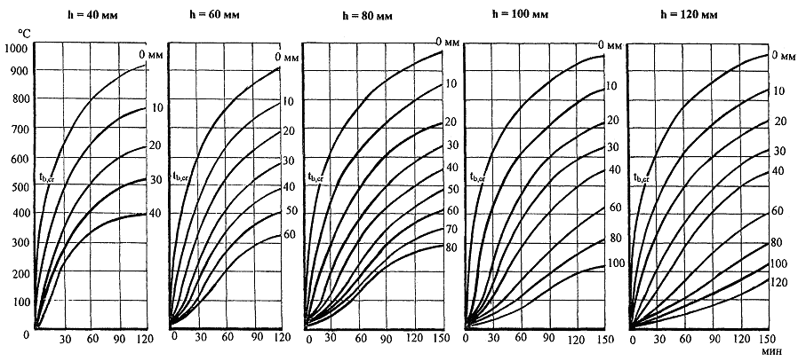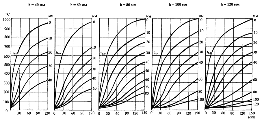 Рис. 34. Температура прогрева тяжелого бетона на известняковом заполнителе в плитах и стенах высотой сечения 40, 60, 80, 100 и 120 мм при одностороннем огневом воздействии. 0 - 120 - глубина прогрева бетона от нагреваемой поверхности, в мм.