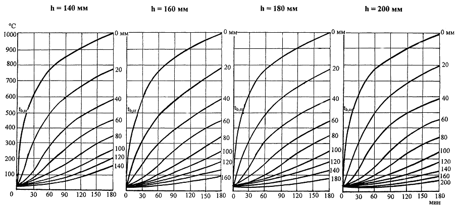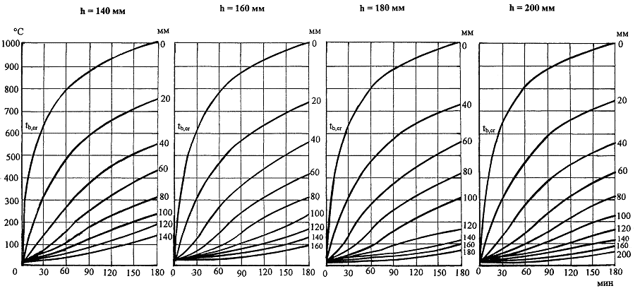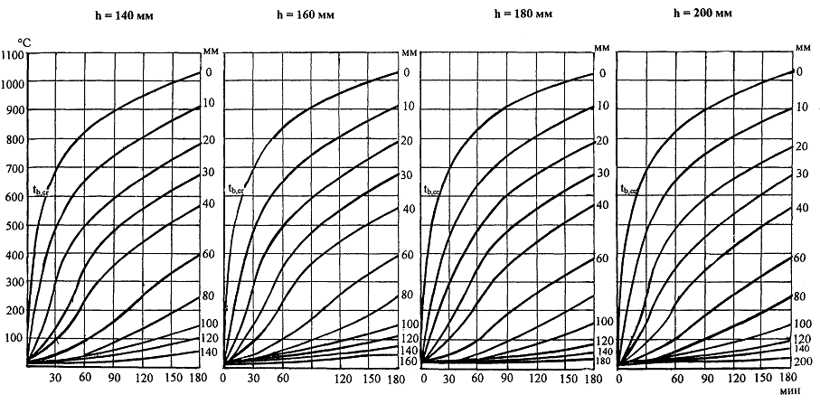 Рис. 33. Температура прогрева тяжелого бетона на гранитном заполнителе в плитах и стенах высотой сечения 140, 160, 180 и 200 мм при одностороннем огневом воздействии. 0 - 200 - глубина прогрева бетона от нагреваемой поверхности, в мм.