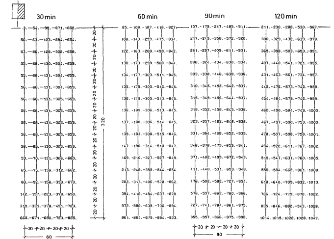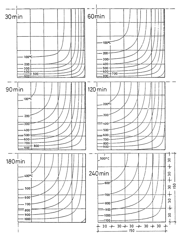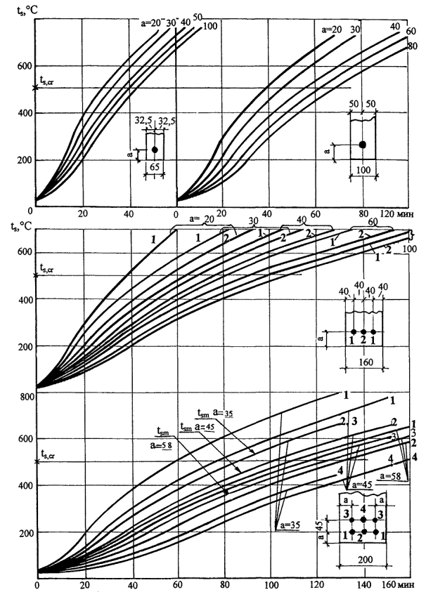 Рис. 36. Температура прогрева конструкционного керамзитобетона в плитах и стенах высотой сечения 40, 60, 80, 100 и 120 мм при одностороннем огневом воздействии. 0 - 120 - глубина прогрева бетона от нагреваемой поверхности, в мм. Рис. 37. Температура прогрева конструкционного керамзитобетона в плитах и стенах высотой сечения 140, 160, 180 и 200 мм при одностороннем огневом воздействии. 0-200 - глубина прогрева бетона от нагреваемой поверхности, мм. ПРИЛОЖЕНИЕ 4ТЕМПЕРАТУРЫ НАГРЕВА АРМАТУРЫ В БАЛКАХРис. 38. Температура нагрева арматуры в балках шириной 65, 100, 160 и 200 мм из тяжелого бетона на известняковом заполнителе при толщине защитного слоя бетона «а» от 20 до 100 мм. tsm - средняя температура арматуры, °С. ПРИЛОЖЕНИЕ 5ТЕМПЕРАТУРЫ ПРОГРЕВА БЕТОНА В КОЛОННАХ, БАЛКАХ И РЕБРИСТЫХ КОНСТРУКЦИЯХРис. 39. Температуры прогрева бетона в колонне сечением 200´200 мм при четырехстороннем воздействии пожара длительностью 30 и 60 минут. Рис. 40. Температуры прогрева бетона в колонне сечением 200´200 мм при четырехстороннем воздействии пожара длительностью 90 и 120 минут. Рис. 41. Изотермы в бетоне колонны сечением 300´300 мм при четырехстороннем огневом воздействии стандартного пожара длительностью 30, 60, 90, 120, 180 и 240 минут. Рис. 42. Температуры прогрева бетона в колонне сечением 400´400 мм при четырехстороннем воздействии пожара длительностью 30 и 60 минут.