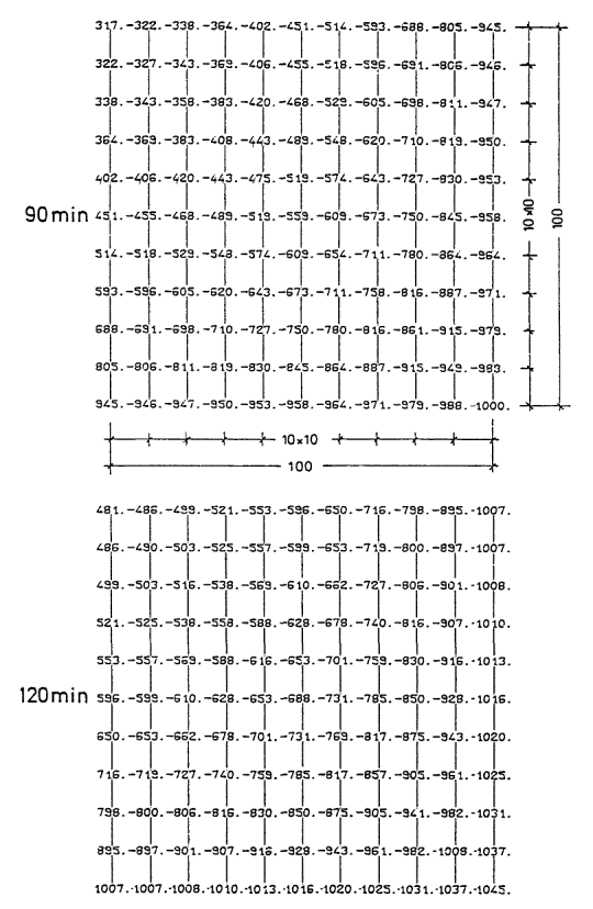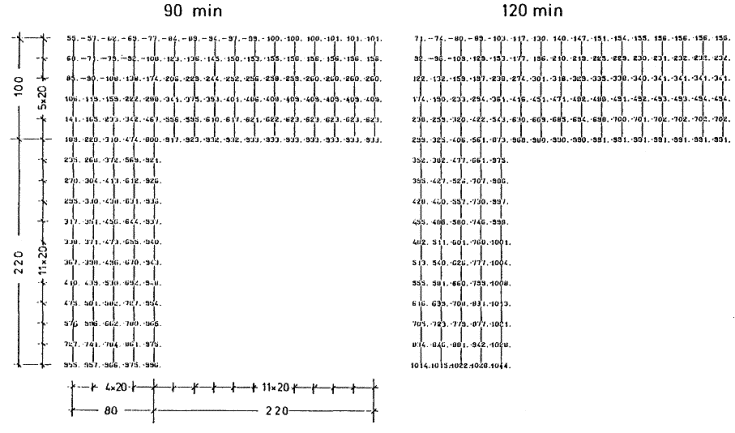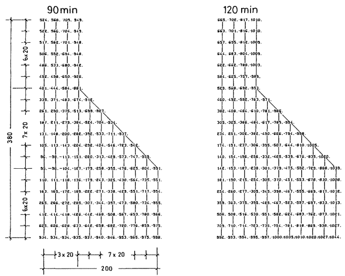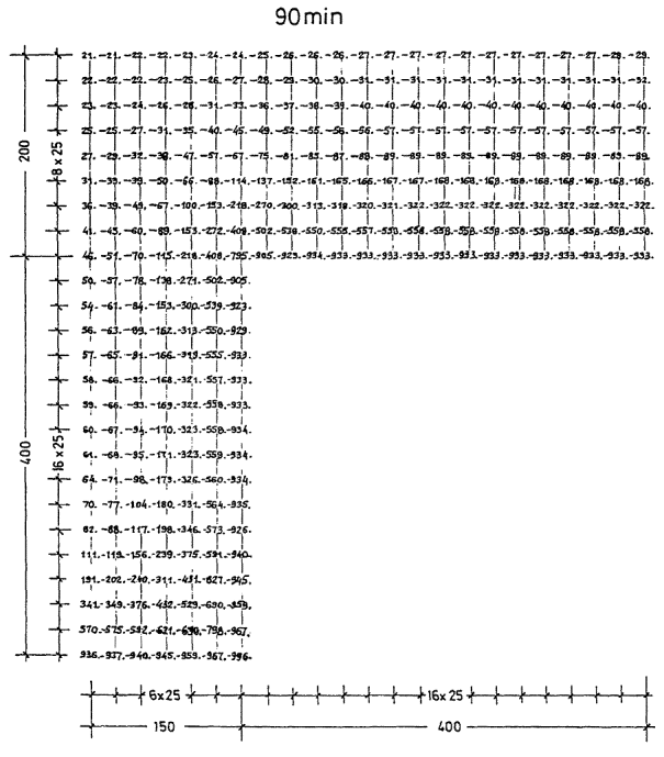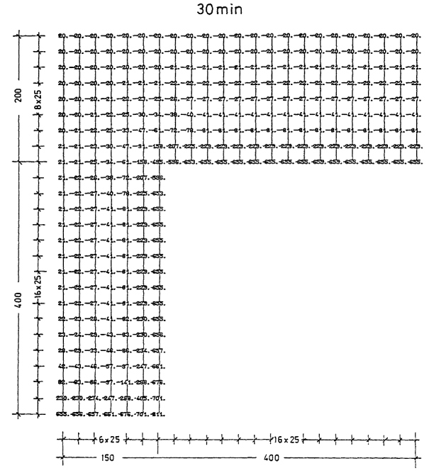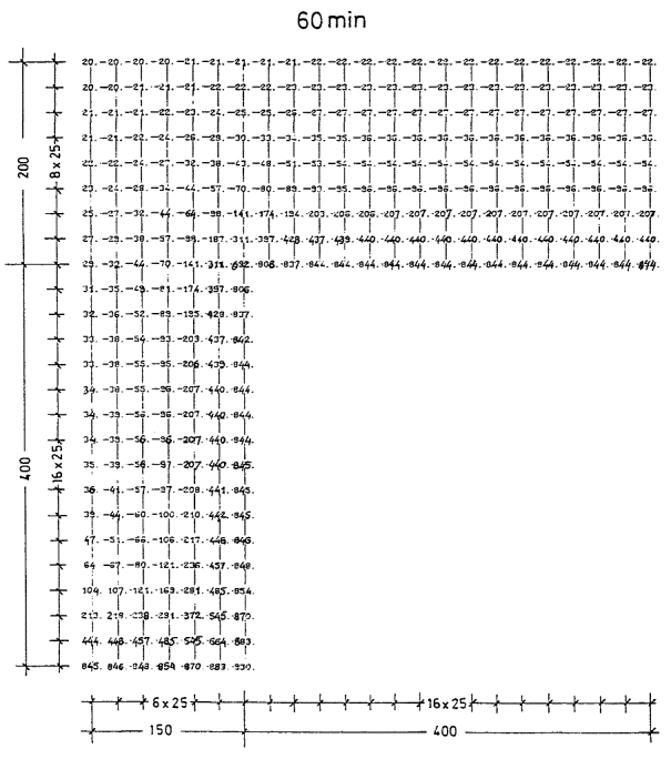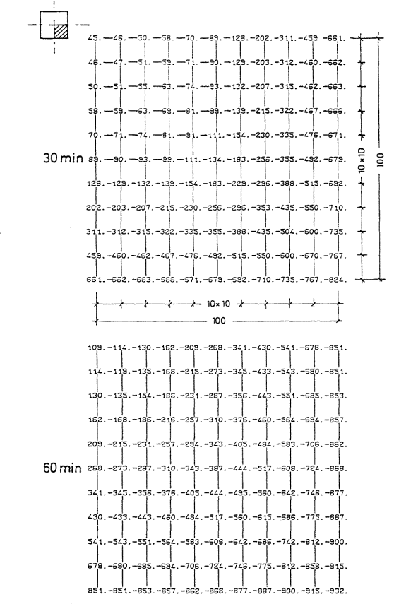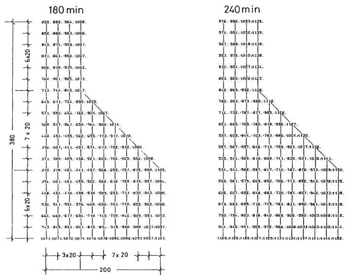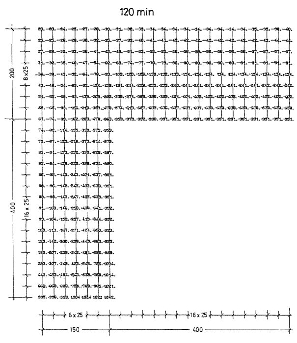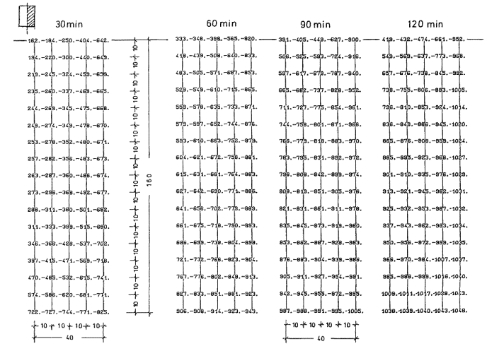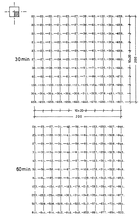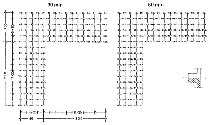Рис. 43. Температуры прогрева бетона в колонне сечением 400´400 мм при четырехстороннем огневом воздействии стандартного пожара длительностью 90 и 120 минут. Рис. 44. Температуры прогрева бетона в колонне сечением 400´400 мм при четырехстороннем огневом воздействии стандартного пожара длительностью 180 и 240 минут. Рис. 45. Температуры прогрева бетона в балке сечением 80´160 мм при трехстороннем воздействии пожара длительностью 30, 60, 90 и 120 минут. Рис. 46. Температуры прогрева бетона в балке сечением 160´320 мм при трехстороннем воздействии пожара длительностью 30, 60, 90 и 120 минут. Рис. 47. Изотермы в бетоне балки сечением 300´600 мм при трехстороннем огневом воздействии стандартного пожара длительностью 30, 60 и 90 минут. Рис. 48. Изотермы в бетоне балки сечением 300´600 мм при трехстороннем огневом воздействии стандартного пожара длительностью 120, 180 и 240 минут. Рис. 49. Температуры прогрева бетона в монолитном ребристом перекрытии с балкой сечением 80´160 мм и плитой толщиной 60 мм при пожаре длительностью 30 и 60 минут. Рис. 50. Температуры прогрева бетона в монолитном ребристом перекрытии с балкой сечением 160´320 мм и плитой толщиной 100 мм при пожаре длительностью 30 и 60 минут. Рис. 51. Температуры прогрева бетона в монолитном ребристом перекрытии с балкой сечением 160´320 мм и плитой толщиной 100 мм при пожаре длительностью 90 и 120 минут. Рис. 52. Температуры прогрева бетона в монолитном ребристом перекрытии с балкой сечением 300´600 мм и плитой толщиной 200 мм при пожаре длительностью 30 минут.