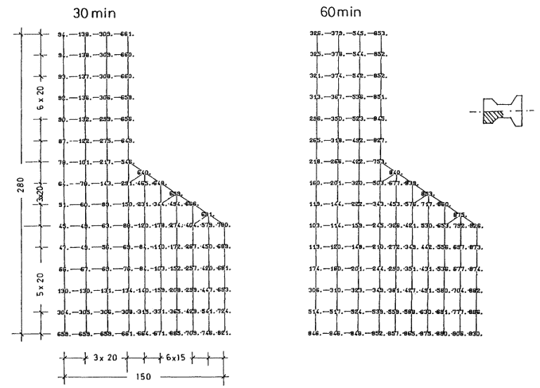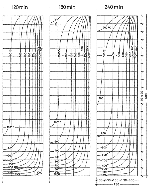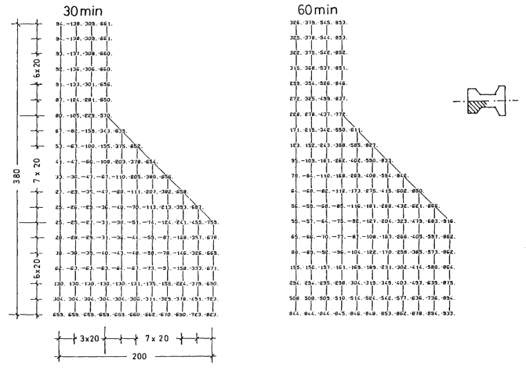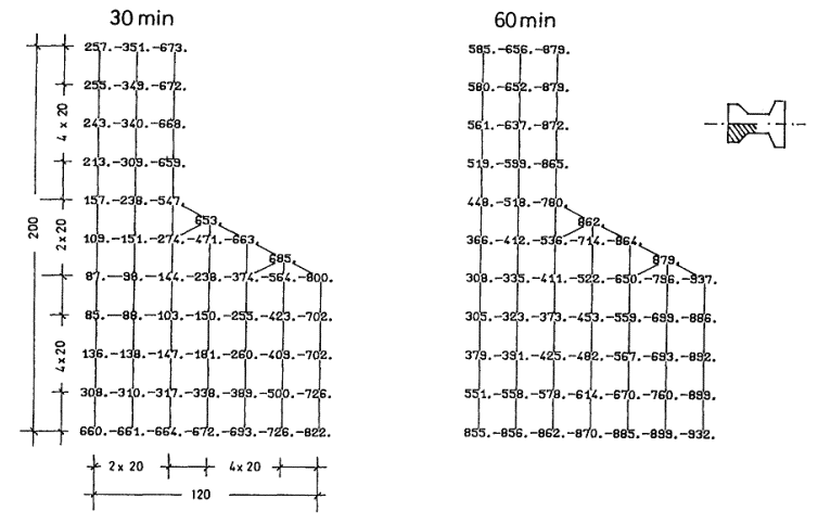 Рис. 56. Температуры прогрева бетона в монолитном ребристом перекрытии с балкой сечением 300´600 мм и плитой толщиной 200 мм при пожаре длительностью 180 минут. Рис. 57. Температуры прогрева бетона в монолитном ребристом перекрытии с балкой сечением 300´600 мм и плитой толщиной 200 мм при пожаре длительностью 240 минут. Рис. 58. Температуры прогрева бетона в двутавровой балке со стенкой толщиной 80 мм и полкой шириной 240 мм при пожаре длительностью 30 и 60 минут. Рис. 59. Температуры прогрева бетона в двутавровой балке со стенкой толщиной 120 мм и полкой шириной 300 мм при пожаре длительностью 30 и 60 минут. Рис. 60. Температуры прогрева бетона в двутавровой балке со стенкой толщиной 120 мм и полкой шириной 300 мм при пожаре длительностью 90 и 120 минут. Рис. 61. Температуры прогрева бетона в двутавровой балке со стенкой толщиной 120 мм и полкой шириной 400 мм при пожаре длительностью 30 и 60 минут.