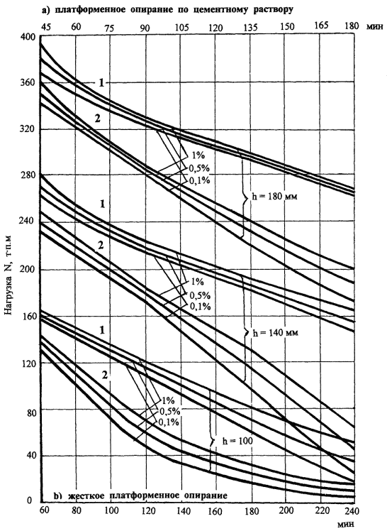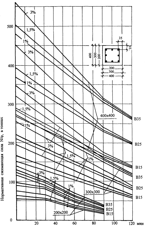 Рис. 62. Температуры прогрева бетона в двутавровой балке со стенкой толщиной 120 мм и полкой шириной 400 мм при пожаре длительностью 90 и 120 минут. Рис. 63. Температуры прогрева бетона в двутавровой балке со стенкой толщиной 120 мм и полкой шириной 400 мм при пожаре длительностью 180 и 240 минут. ПРИЛОЖЕНИЕ 6ПРЕДЕЛЫ ОГНЕСТОЙКОСТИ ЖЕЛЕЗОБЕТОННЫХ КОЛОНН И СТЕН ИЗ ТЯЖЕЛОГО БЕТОНАРис. 64. Пределы огнестойкости железобетонных колонн сечением 200´200, 300´300 и 400´400 мм из тяжелого бетона на гранитном заполнителе, с защитным слоем 35 мм, с армированием 1,0, 1,5 и 3,0 % при действии нормативной сжимающей силы со случайным эксцентриситетом, при четырехстороннем огневом воздействии стандартного пожара. Рис. 65. Пределы огнестойкости железобетонных колонн сечением 200´200, 300´300 и 400´400 мм из тяжелого бетона на известняковом заполнителе, с защитным слоем 35 мм, с армированием 1, 1,5 и 3 %, при действии нормативной сжимающей силы со случайным эксцентриситетом, при четырехстороннем огневом воздействии стандартного пожара. Рис. 66. Пределы огнестойкости железобетонных стен высотой сечения 100, 140 и 180 мм, с армированием 0,1, 0,5 и 1 %, из тяжелого бетона класса В15 с заполнителями: 1 - из известняка; 2 - из гранита, при одностороннем огневом воздействии стандартного пожара.