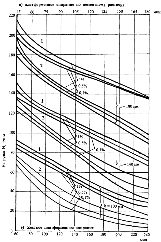 Рис. 67. Пределы огнестойкости железобетонных стен высотой сечения 100, 140 и 180 мм, с армированием 0,1, 0,5 и 1 %, из тяжелого бетона класса В25 с заполнителями: 1 - из известняка; 2 - из гранита, при одностороннем огневом воздействии стандартного пожара. Рис. 68. Пределы огнестойкости железобетонных стен толщиной 100, 140 и 180 мм, с армированием 0,1, 0,5 и 1 %, из тяжелого бетона класса В35 с заполнителями: 1 - из известняка; 2 - из гранита, при одностороннем огневом воздействии стандартного пожара. ОСНОВНЫЕ БУКВЕННЫЕ ОБОЗНАЧЕНИЯУсилия от нагрузки и температуры в поперечном сечении элемента при огневом воздействии Мn, М, Mt - изгибающий момент от нормативной и расчетной нагрузок и от температуры; Nn, N, Nt - продольная сила от нормативной и расчетной нагрузок и от температуры; Qn, Q, Qt - поперечная сила от нормативной и расчетной нагрузок и от температуры; uc, uф - длительность стандартного и фактического пожаров. Характеристики материалов при огневом воздействии