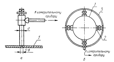 Дата введения 01.07.91 Настоящим стандарт устанавливает методы определения давления или разрежения (далее - давления) и температуры газопылевых потоков (далее - газов), отходящих от стационарных источников загрязнения в газоходах и вентиляционных системах. 1. МЕТОД ОПРЕДЕЛЕНИЯ ДАВЛЕНИЯ ГАЗА.Метод определения давления основан на измерении разности давления газов в газоходе по отношению к атмосферному давлению воздуха. 1.1. Средства измерений, устройства и реактивы. Микроманометры типа ММН-2400(5)-1,0 по нормативно-технической документации класса точности 1,0. Манометры жидкостные U-образные по ГОСТ 9933. Манометры (вакуумметры) показывающие по ГОСТ 2405, класса точности 1,5. Трубки напорные конструкции НИИОГАЗа по ГОСТ 17.2.4.06. Спирт этиловый по ГОСТ 17299. Трубки медицинские резиновые типа 1 по ГОСТ 3399 или полиэтиленовые по ГОСТ 18599. Трубки стальные водогазопроводные по ГОСТ 3262. Допускается заменять указанные средства измерений на аналогичные, не уступающие им по метрологическим характеристикам. 1.2. Подготовка к измерениям. 1.2.1. При выполнении измерений должны быть соблюдены условия в соответствии с требованиями ГОСТ 17.2.4.06, разд. 2, 3 и настоящего стандарта. 1.2.2. Давление в газоходах диаметром до 500 мм измеряют в одной точке у стенки (черт. 1 а). Для газоходов диаметром свыше 500 мм давление измеряют в четырех точках, расположенных на двух взаимно перпендикулярных диаметрах и объединенных с целью усреднения давления кольцевым трубопроводом, присоединяемым к измерительному прибору (черт. 1 б). 1 - стенка газохода; 2 - патрубок; 3 - соединительный трубопровод. Черт. 1. 1.2.3. Собрать измерительную схему в соответствии с черт. 1. 1.2.4. Если расстояние до средств измерений превышает 15 м и при проведении постоянных измерений средства измерений присоединяют к газоходу, используют стальные водогазопроводные трубы диаметром 10 - 38 мм. При проведении разовых измерений в качестве соединительных трубок применяют резиновые трубки диаметром не менее 4 мм. 1.2.5. Диаметр стальных водогазопроводных соединительных труб для монтажа кольцевого трубопровода зависит от степени запыленности газов (табл. 1). Таблица 1
