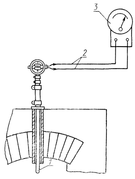 2.1.2. Термопары типа ТХЛ-0806 по ТУ 25.02.1133 и ТУ 25.02.1136 с пределами измерений от 0 до 1000 °С, инерционность не более 3,5 мин и длиной монтажной части 180; 200; 320; 400; 800; 1250 мм. 2.1.3. Вторичные измерительные приборы к термопарам: - пирометрические милливольтметры типов М-64, МВУ-6, МР-64, Ш4500, Ш4501, Щ69003 и др. по ГОСТ 13881, класса точности 1,5, градуировка ХА; - переносной потенциометр типа ПП-63 по ГОСТ 9245, класса точности 0,02; - автоматические электронные потенциометры типов КСР, КСУ, КСМ и др. по ГОСТ 7164, класса точности 0,5, градуировки ХА. 2.1.4. Допускается применять аналогичные средства измерений, обеспечивающие те же метрологические характеристики. 2.2. Подготовка к измерениям. 2.2.1. При выполнении измерений должны быть соблюдены условия в соответствии с требованиями ГОСТ 17.2.4.06 и настоящего стандарта. 2.2.2. В зависимости от количества точек измерения температуры газа они должны располагаться следующим образом: - для одной точки измерения - в центре газохода; - для точек измерения количеством больше единицы - по кольцу от 1/6 до 1/3 диаметра для газохода круглого сечения или на полосе по периметру от 1/6 до 1/3 линейного размера прямоугольного газохода. Точки измерения в этом случае должны располагаться в противоположных по отношению к оси газохода сторонах; - измерения в разных точках должны производиться одновременно. 2.2.3. С целью устранения погрешностей необходимо: - не допускать утечек теплового потока в месте установки средств измерений; - обеспечить минимальное тепловое сопротивление между рабочим концом средства измерения и газовым потоком; - в случае размещения термоприемника в защитном металлическом чехле или гильзе для улучшения теплопередачи, т. е. уменьшения динамической погрешности гильзу заполняют маслом, металлическими опилками или снабжают специальными внутренними радиаторами; - при измерении температуры дымовых газов термоприемник следует экранировать от теплового излучения более нагретых тел (пламени, раскаленных участков клади печи и т. д.); - при измерении температуры среды в высокочастотном электромагнитном поле нельзя применять ртутные термометры и другие температурные зонды с массивным металлическим термоприемником. 2.2.4. Собирают измерительную схему в соответствии с черт. 2 и устанавливают средства измерений, уплотнив места их установки с целью устранения подсосов воздуха из окружающей среды. Глубина погружения средства измерений в газоход должна соответствовать паспортной. 2.3. Выполнение измерений. 2.3.1. Метод применяется для измерения температуры газов, не превышающей 1000 °С. 2.3.2. Устанавливают средство измерения в заданную точку газохода и нагревают его до температуры газового потока. Время прогрева (t) вычисляют по формуле t = 4т, (5) где т - инерционность средства измерений, с. 2.3.3. При измерении температуры с помощью термопар (если вторичные приборы, работающие в комплекте с термопарами, не имеют автоматической компенсации температуры свободных концов) необходимо обеспечить стабилизацию температуры их свободных концов. Для этого помещают последние в сосуд с тающим льдом или в процессе измерений контролируют температуру свободных концов. Для этого помещают рядом со свободными концами термометр и обеспечивают условия, при которых его температура будет равна температуре свободных концов термопар. 2.3.4. Температуру в каждой точке измер