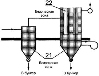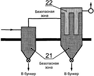 4.5 Примеры классифицируемых зон Зона класса 20 Примеры мест, которые могут быть классифицированы как зона класса 20 внутри пылезащитной оболочки: - загрузочные воронки, бункеры и т.д.; - циклоны и фильтры; - оборудование для транспортировки пылевых продуктов, за исключением некоторых частей ленточного и цепного конвейеров, и т.д.; - мельницы, смесители, сушилки, наполняющее оборудование и т.д.; - наружная сторона пылезащитной оболочки, где плохое техническое обслуживание приводит к образованию слоев пыли неконтролируемой толщины. Зона класса 21 Примеры мест, которые могут быть классифицированы как зона класса 21: - зоны вне пылезащитной оболочки и вблизи крышки смотрового люка, подверженной частому перемещению или открыванию при работе, когда содержащиеся внутри взрывчатые пылевоздушные смеси не находятся при давлении ниже атмосферного; - зоны вне пылезащитной оболочки вблизи мест наполнения и опорожнения, подающие конвейерные ленты, пункты отбора, места разгрузки угля и т.д., где не применяются меры по предотвращению образования взрывчатых пылевоздушных смесей; - зоны вне пылезащитной оболочки, где пыль накапливается и где при работе нарушение слоя пыли может привести к образованию взрывчатых пылевоздушных смесей; - зоны вокруг выпускных отверстий из вентиляторов и фильтров. Так как выходящий из этих отверстий воздух содержит небольшое количество очень мелкой пыли (непрерывный источник с низкой концентрацией), пыль может накапливаться рядом с выпускными отверстиями и через некоторое время создать взрывчатые пылевоздушные смеси, если слои пыли будут нарушены. Зона класса 22 Примеры мест, которые могут быть классифицированы как зона класса 22: - выпускные отверстия фильтров, так как в случае неправильной работы здесь может быть выброс взрывчатых пылевоздушных смесей; - области вблизи оборудования, которое открывается на редкие интервалы, или оборудования, в котором может легко образовываться утечка и где, из-за давления выше атмосферного, пыль будет задута наружу (пневматическое оборудование повышенного давления, гибкие соединения, которые могут создать опасность, и т.д.); - взрывозащитные устройства, основанные на выбросе в атмосферу взрыва, такие как разрывные диски и выпускные окна, которые могут пропускать пыль при открывании; - места хранения мешков, содержащих пылевые продукты. Разрыв мешков может произойти во время перемещения, становясь причиной утечки пыли; - зоны, которые обычно классифицируют как зоны класса 21, могут классифицироваться как зоны класса 22, если применяют меры по предотвращению образования взрывчатых пылевоздушных смесей. Такие меры включают в себя вытяжную вентиляцию. Данные меры должны применяться вблизи мест наполнения и опорожнения, конвейерных линий, мест отбора проб, мест разгрузки угля и т.д.; - зоны, где образуются контролируемые слои пыли, которые маловероятно создают взрывчатые пылевоздушные смеси. В большинстве случаев слой пыли достаточен для образования взрывчатых пылевоздушных смесей. Если слой удален до того, как могут быть образованы взрывчатые пылевоздушные смеси, зона может быть классифицирована как безопасная. Слои пыли неконтролируемой толщины находятся только внутри пылезащитной оболочки при условии, что за пределами установленного оборудования принимают надлежащие ме