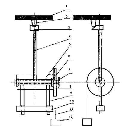 Схема устройства для проверки устойчивости радиоизотопных извещателей к прямому механическому удару (удар молотком): 1 - доска; 2 - радиоизотопный извещатель; 3 - ударник; 4 - ручка молотка; 5 - стальной цилиндр; 6 - подшипники; 7 - рам; 8 - ворот; 9 - стальные ручки; 10 - стальной противовес; 11 - нить; 12 - рабочий груз СОДЕРЖАНИЕ