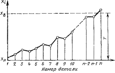 2.2. Пример. При обработке вала по диаметру 13,3h8-0,27 на токарном автомате в мгновенной выборке, состоящей из пяти деталей, были получены отклонения диаметра от начала отсчета, которое было принято равным 13 мм; 0,25; 0,28; 0,26; 0,1; 0,14 мм.